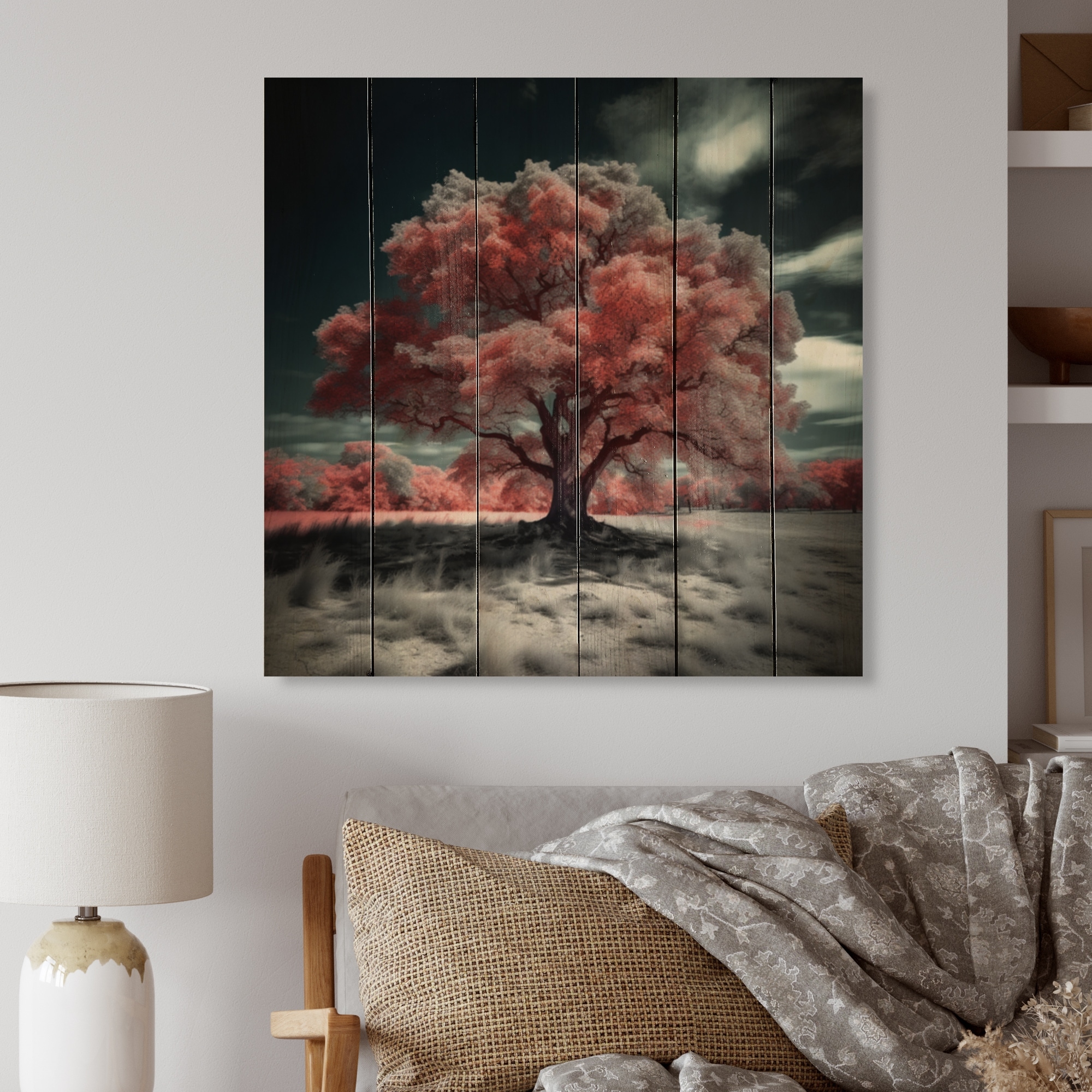 Designart "Red Tree Winter Haven" Tree Floral Print on Natural Pine Wood