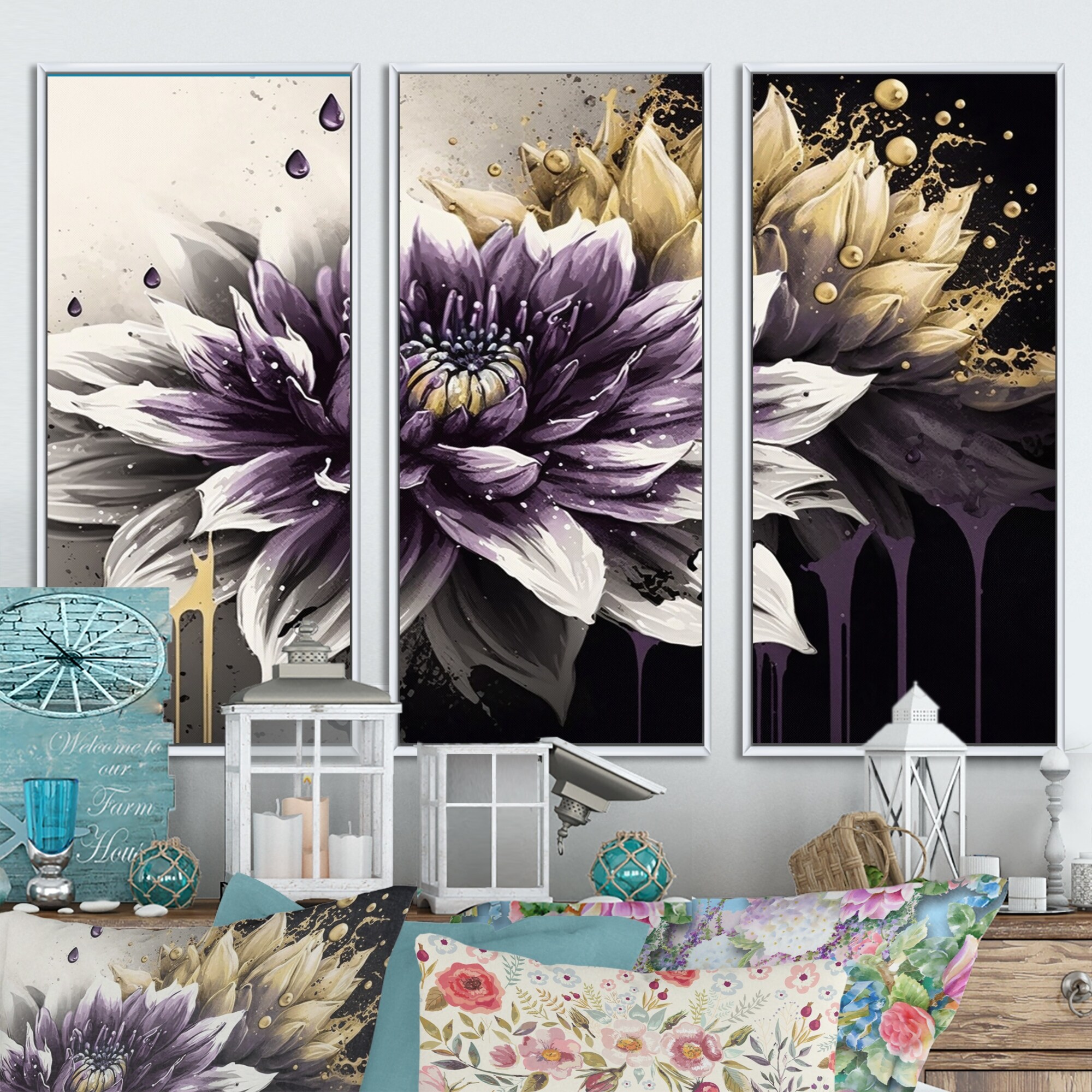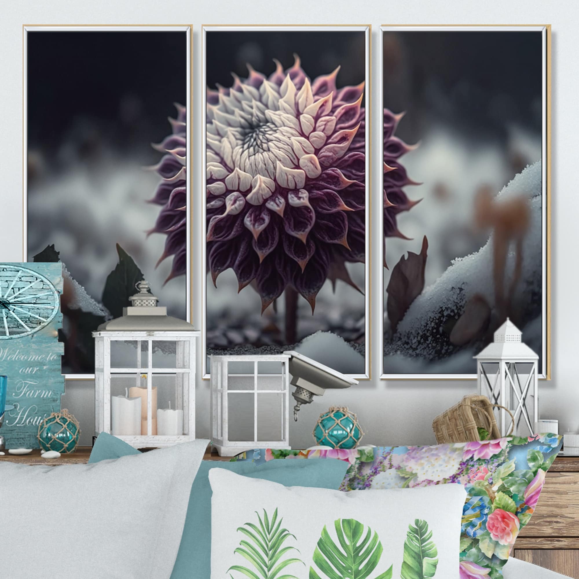 Designart "A Blooming Purple Dahlia Flower in Winter III" Floral Rose Framed Canvas Art Print - 3 Panels