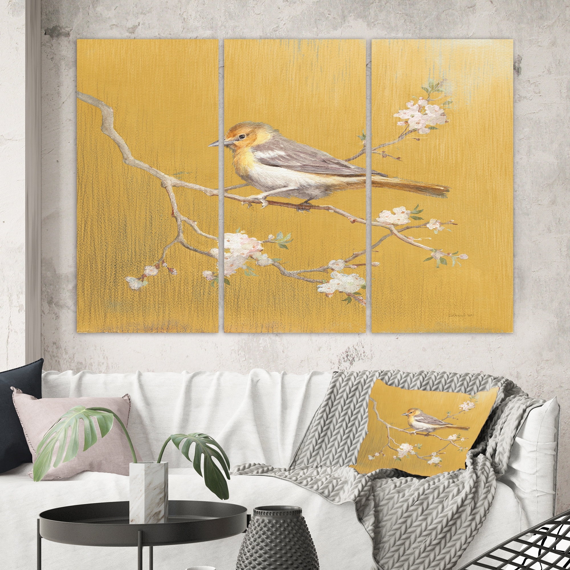 Designart "Gold Bird on Blossoms I" Farmhouse Gallery-wrapped Canvas