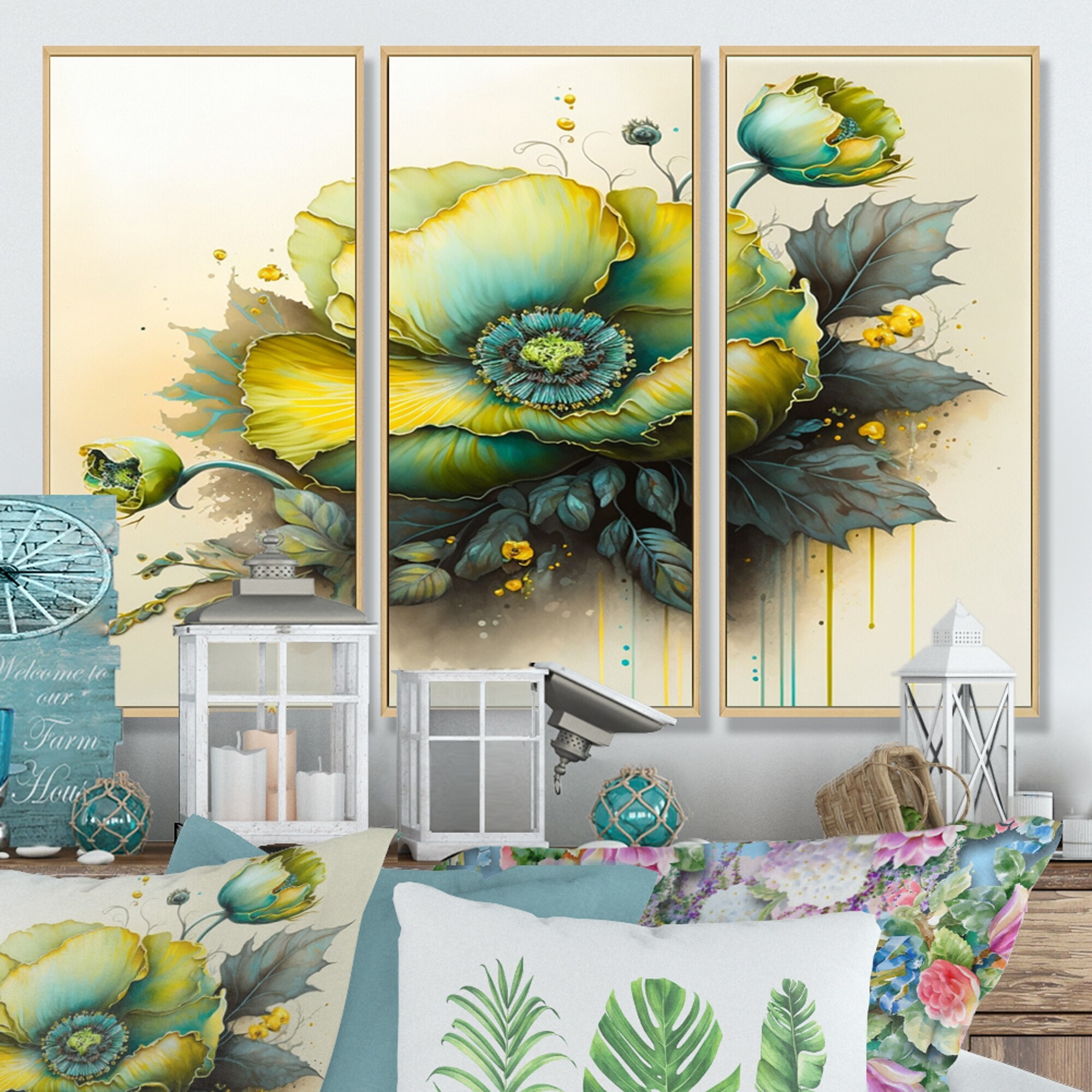 Designart "Vibrant Green Poppy Flowers I" Floral Poppy Framed Canvas Art Print - 3 Panels