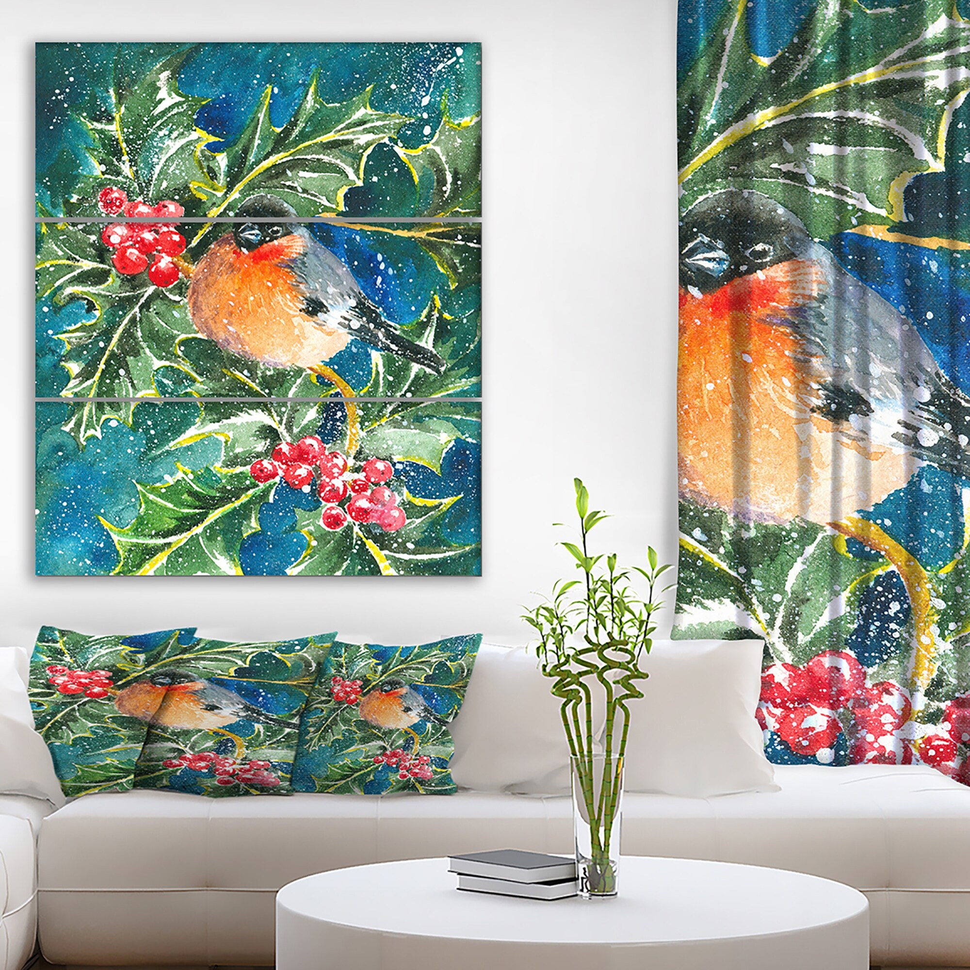 Designart "Bullfinch and Holly" Animals Print on Wrapped Canvas set - 28x36 - 3 Panels
