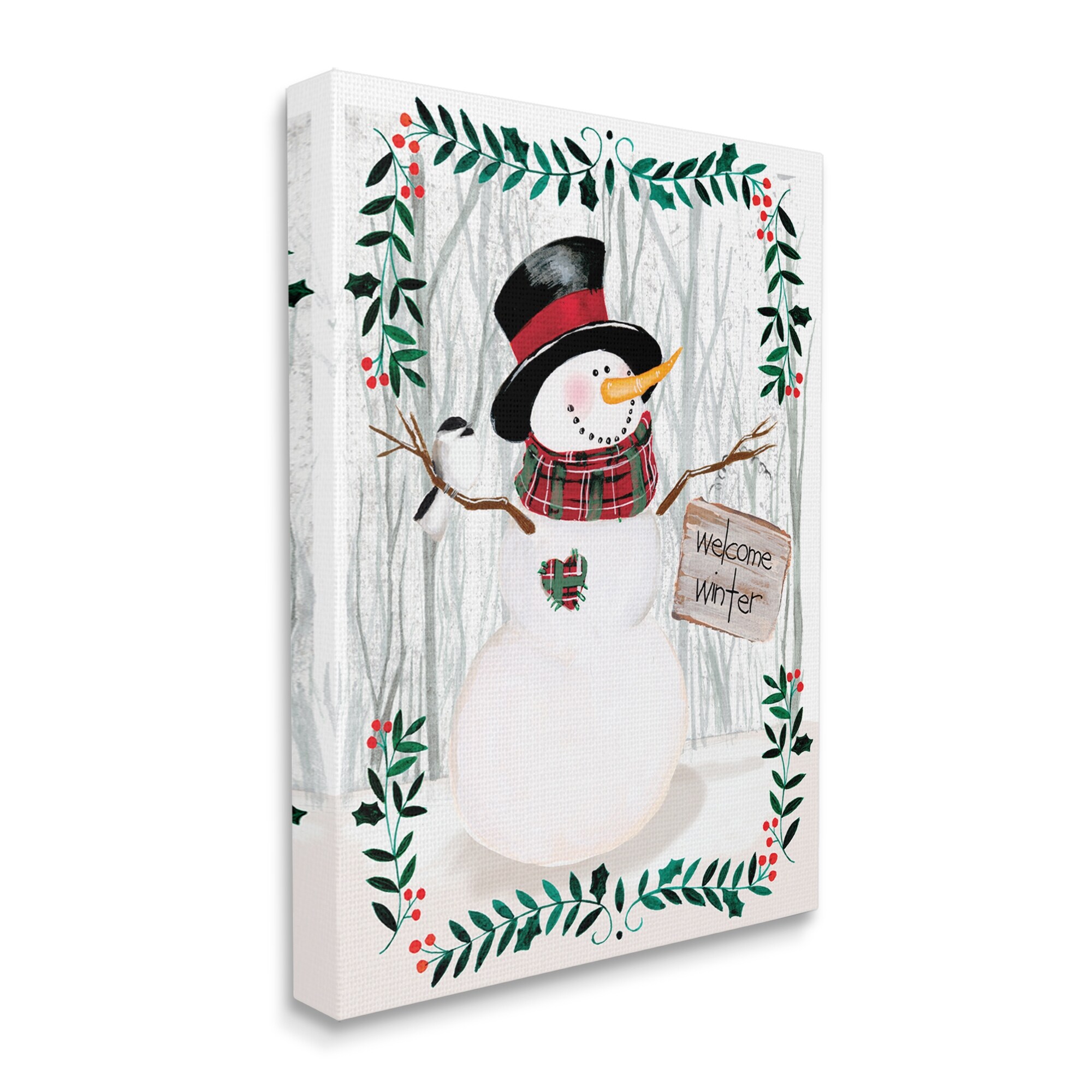 Stupell Industries Winter Welcome Greeting Snowman Forest Holly Florals Canvas Wall Art