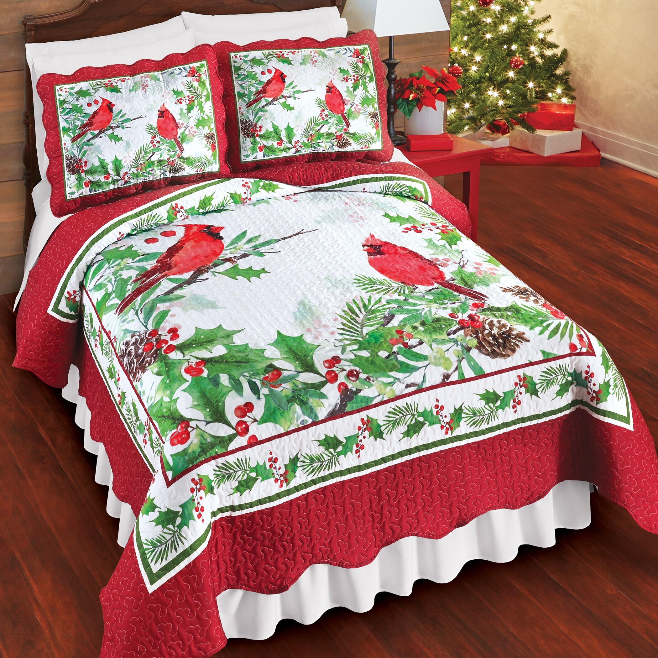 Festive Holly Cardinal Scalloped Edge Quilt