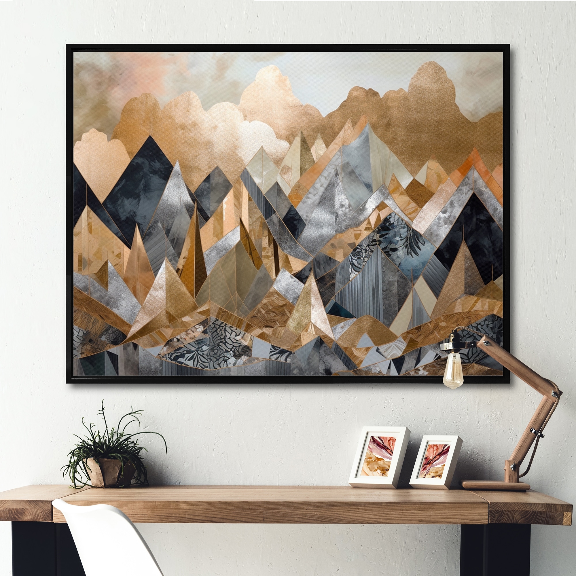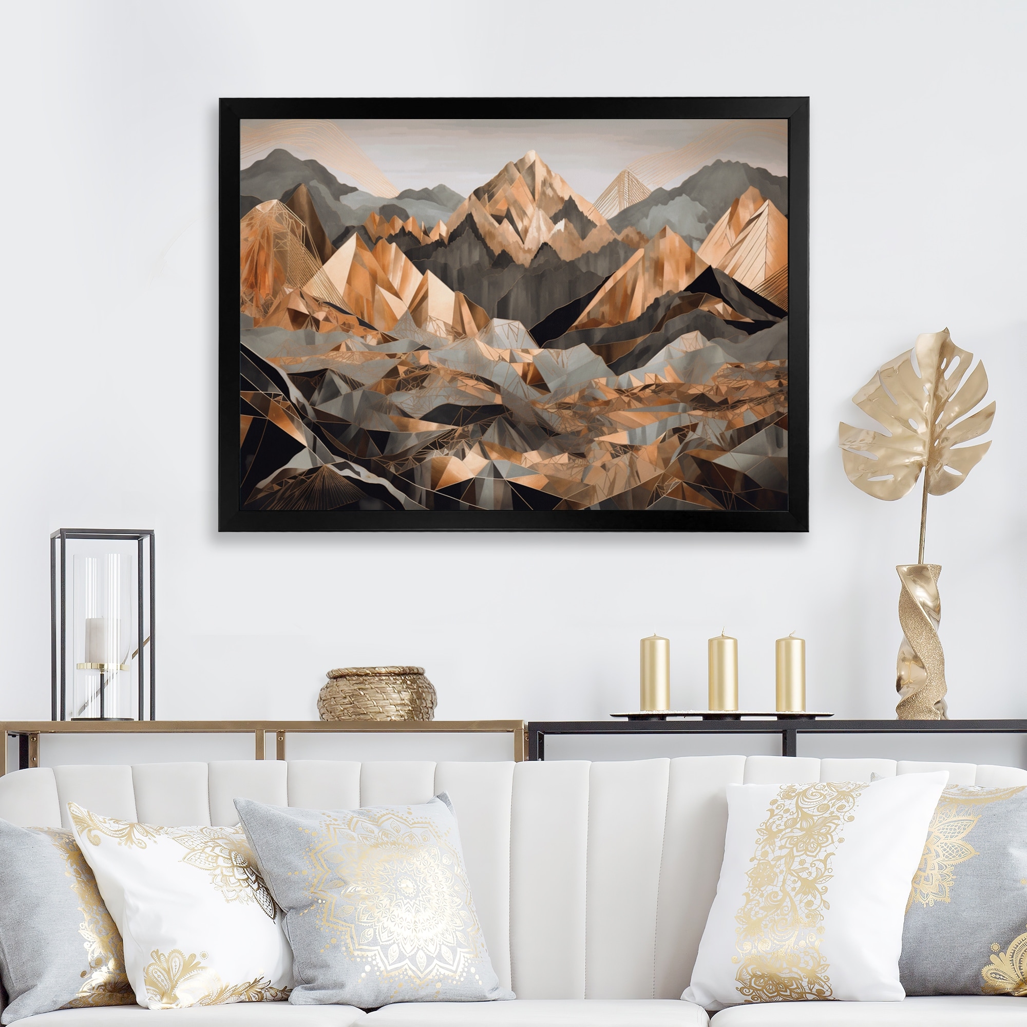 Designart "Grey And Gold Geometric Horizons Iii" City Geometric Framed Wall Art Prints