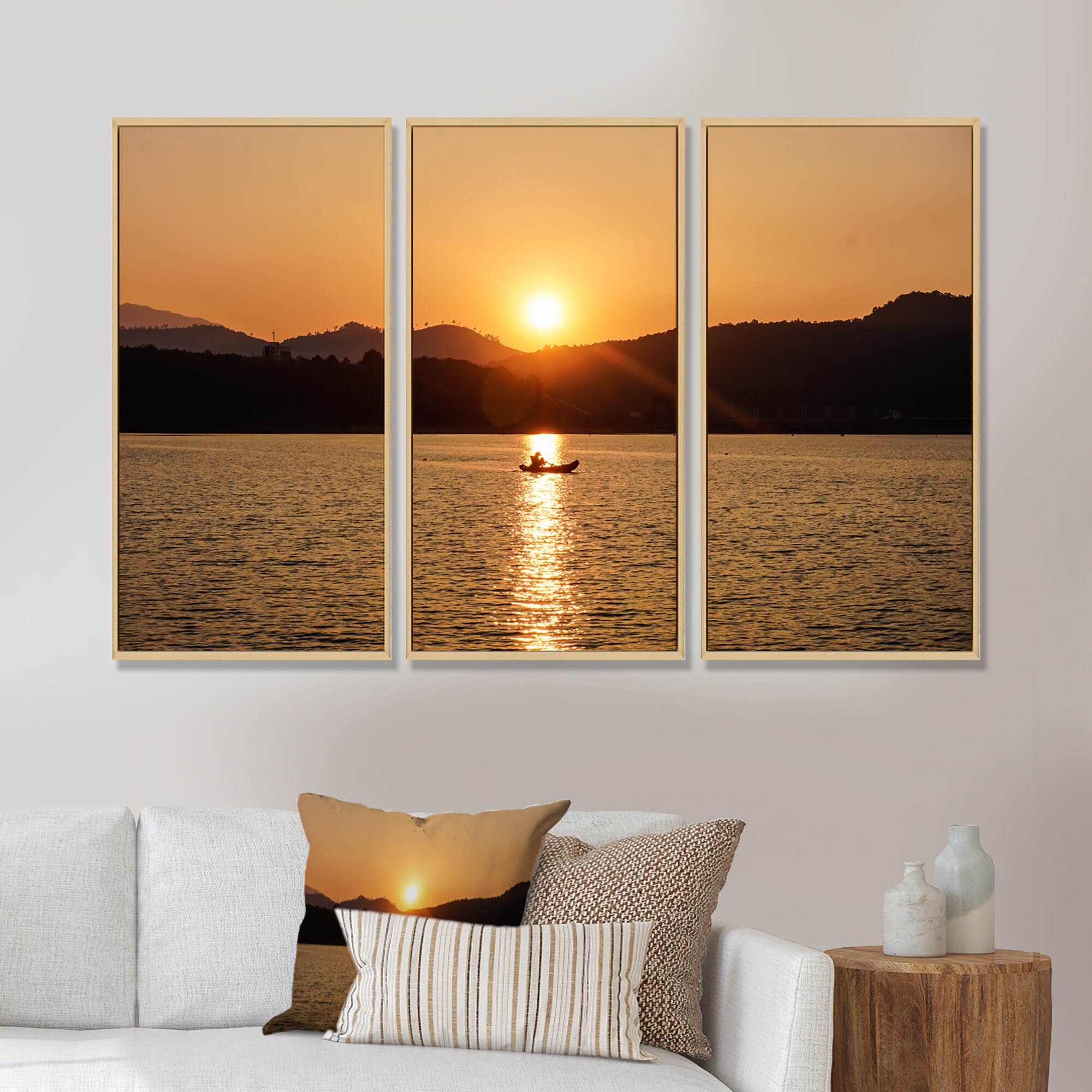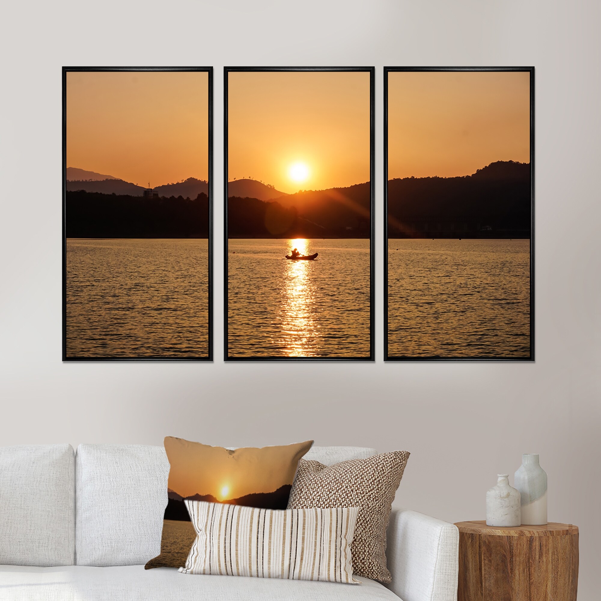 Designart "Sunset Over MountaIn Lake Horizon" Modern Framed Art Prints Set of 3 - 4 Colors of Frames