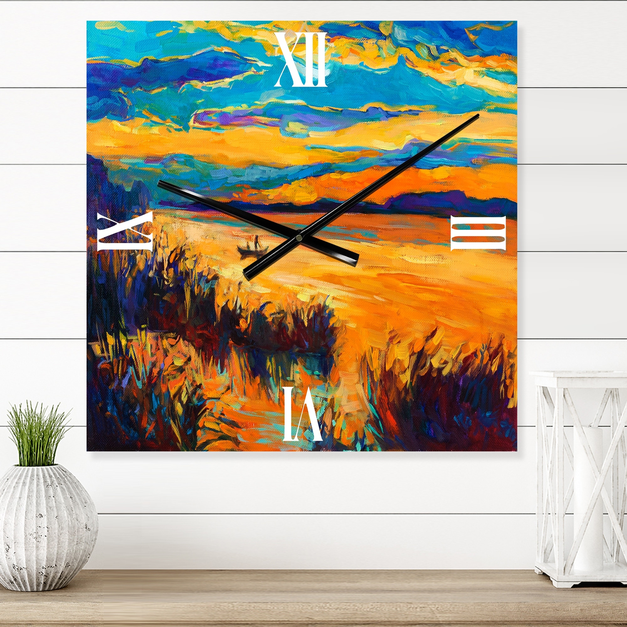 Designart 'Little Boat At the Horizon of a Lake During Sunset' Nautical & Coastal Large Wall Clock