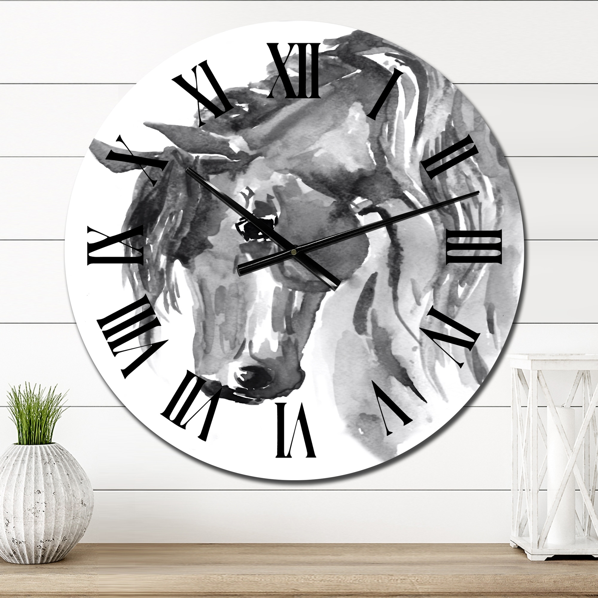 Designart 'Black And White Horse Portrait I' Traditional wall clock