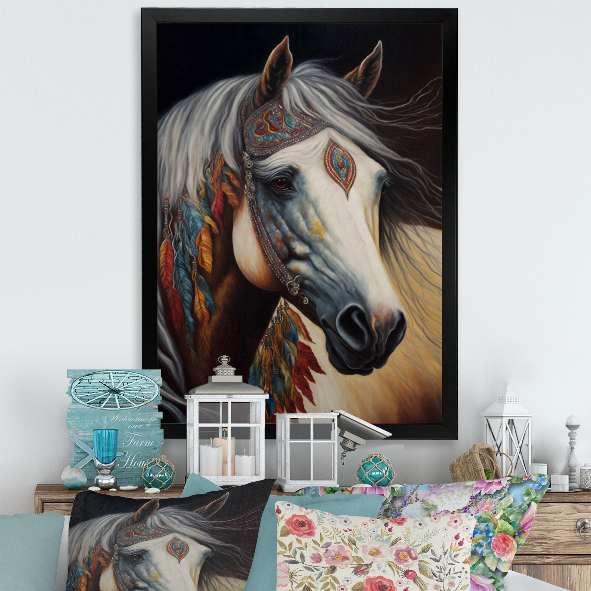 Designart "Amerindian Horse With Feathers II" Modern Framed Art Print