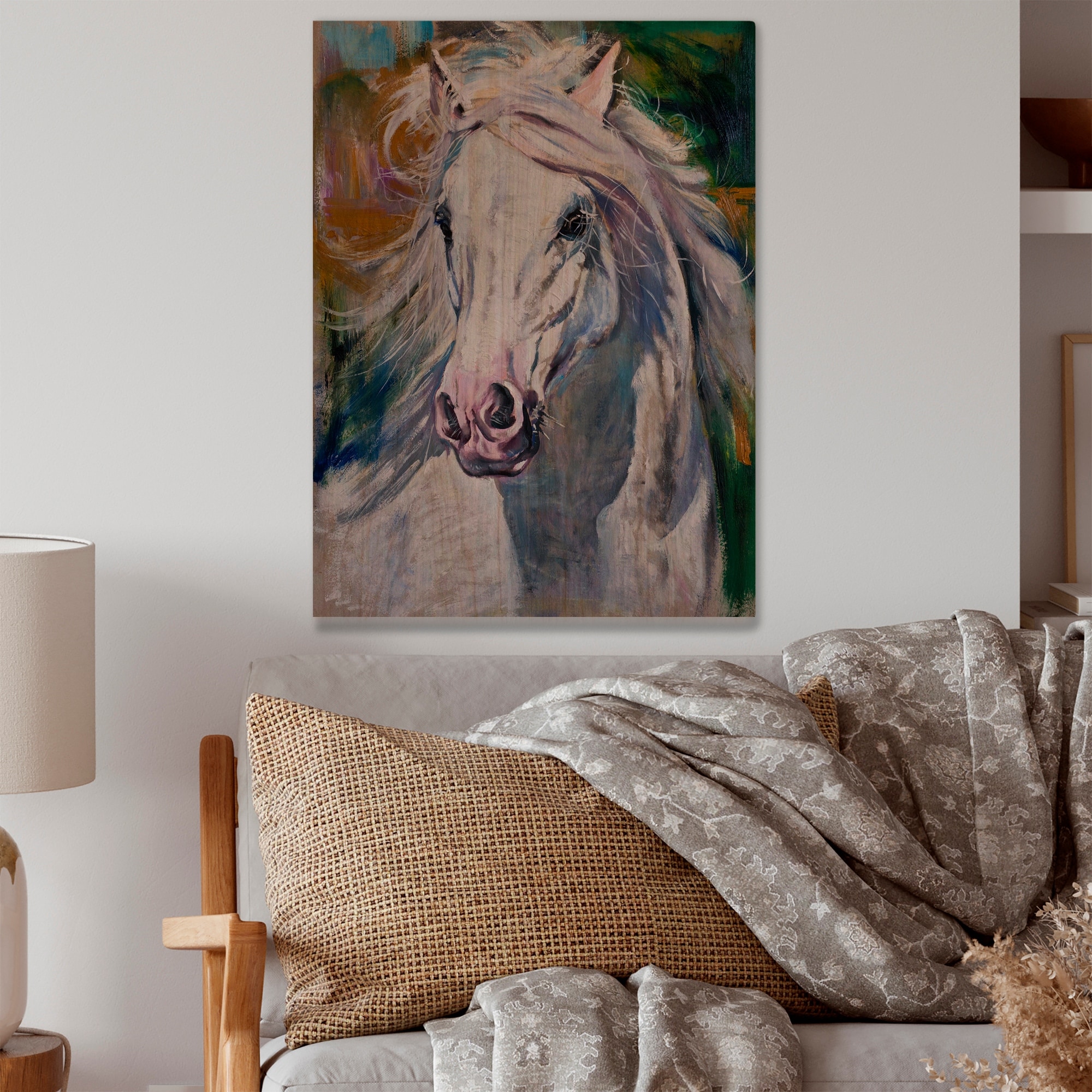 Designart 'Beautiful White Horse Portrait' Farmhouse Wood Wall Art Panels - Natural Pine Wood