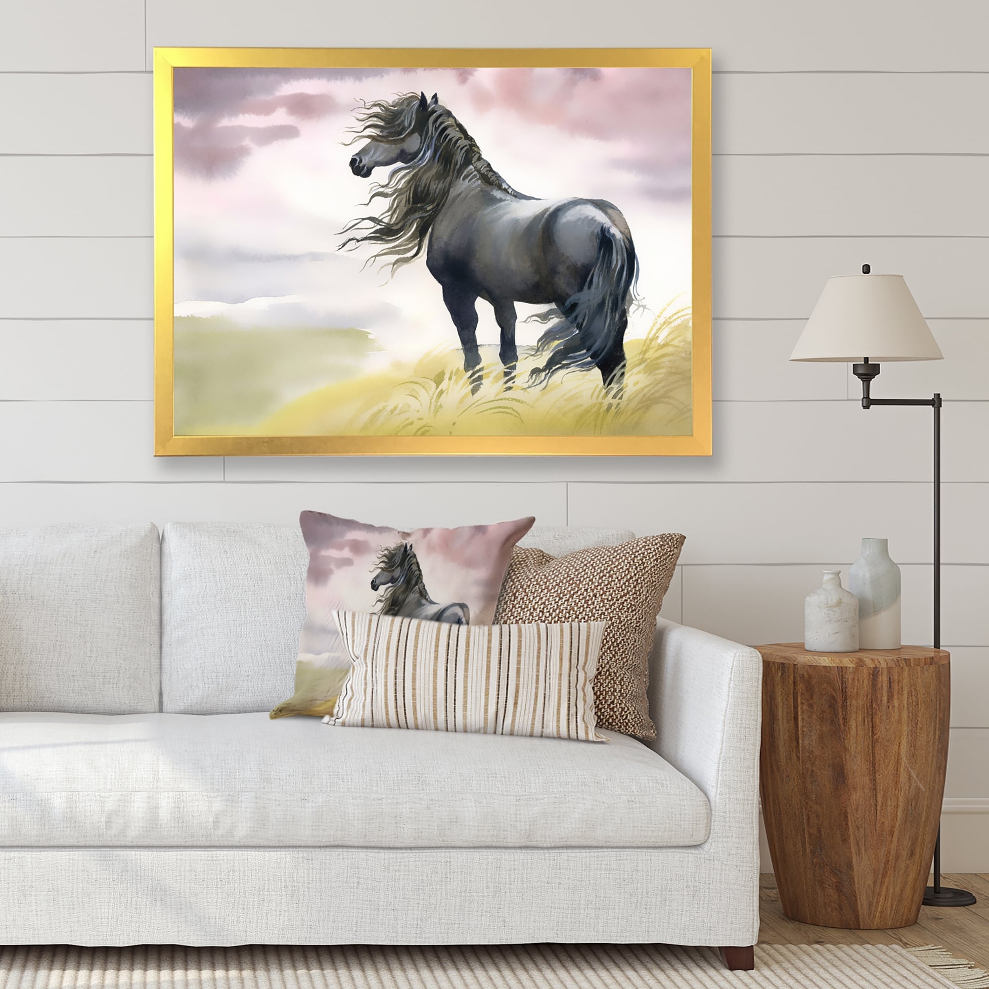 Designart "Black Horse in A Field" Traditional Framed Art Print