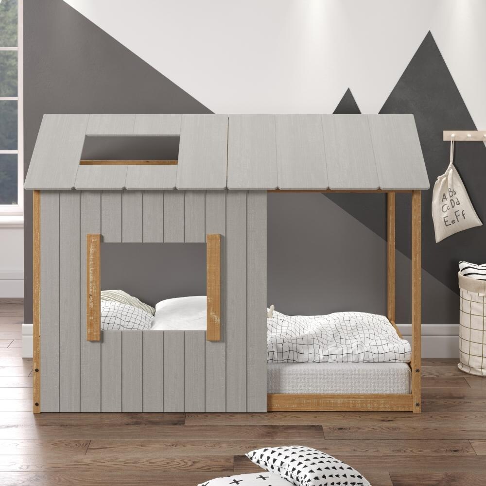 Twin Size Low Loft Wood House Bed with Two Side Windows