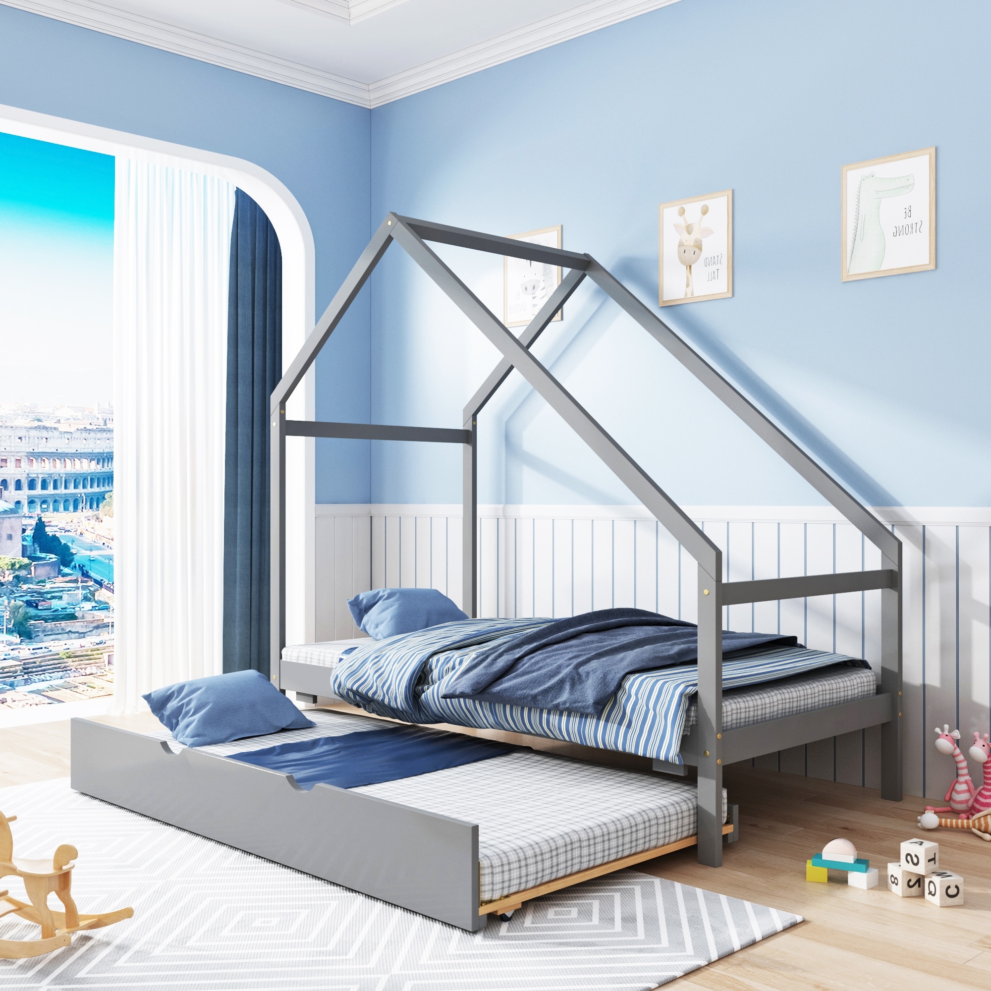 Modern Twin Size Wooden House Bed With Twin Size Trundle