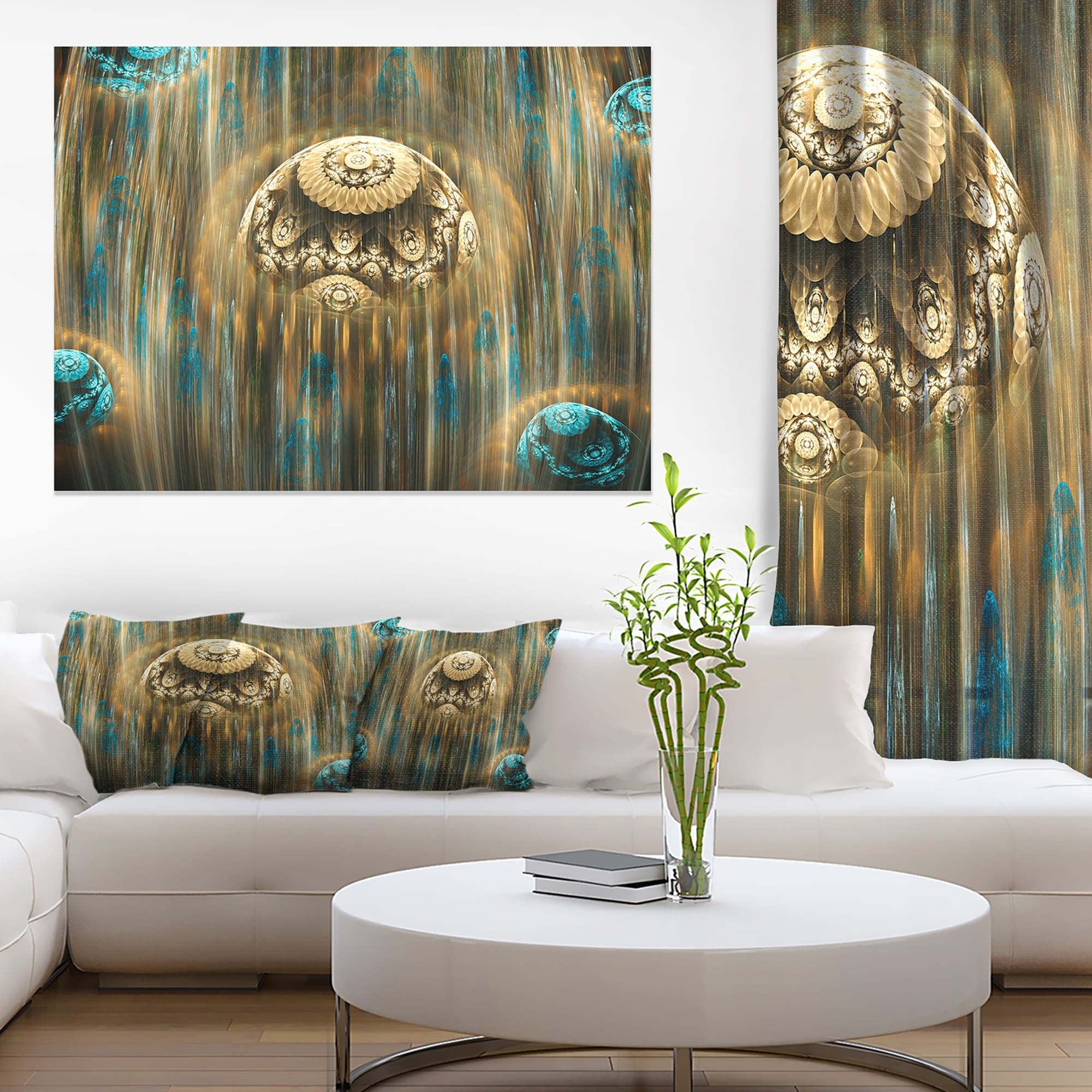 Designart "Yellow Teal Abstract Fractal Infinite Ripples" Fractals Framed Wall Art Living Room