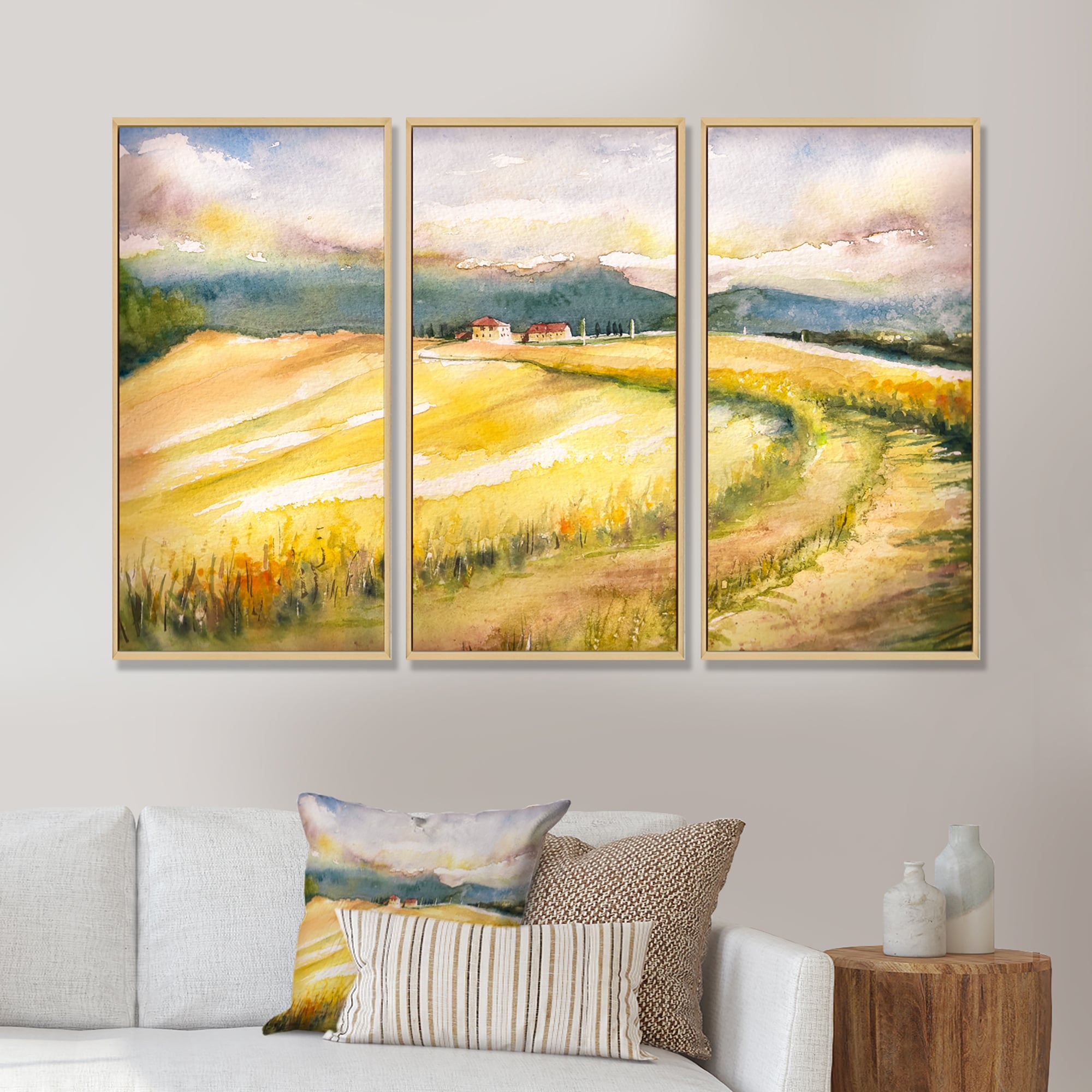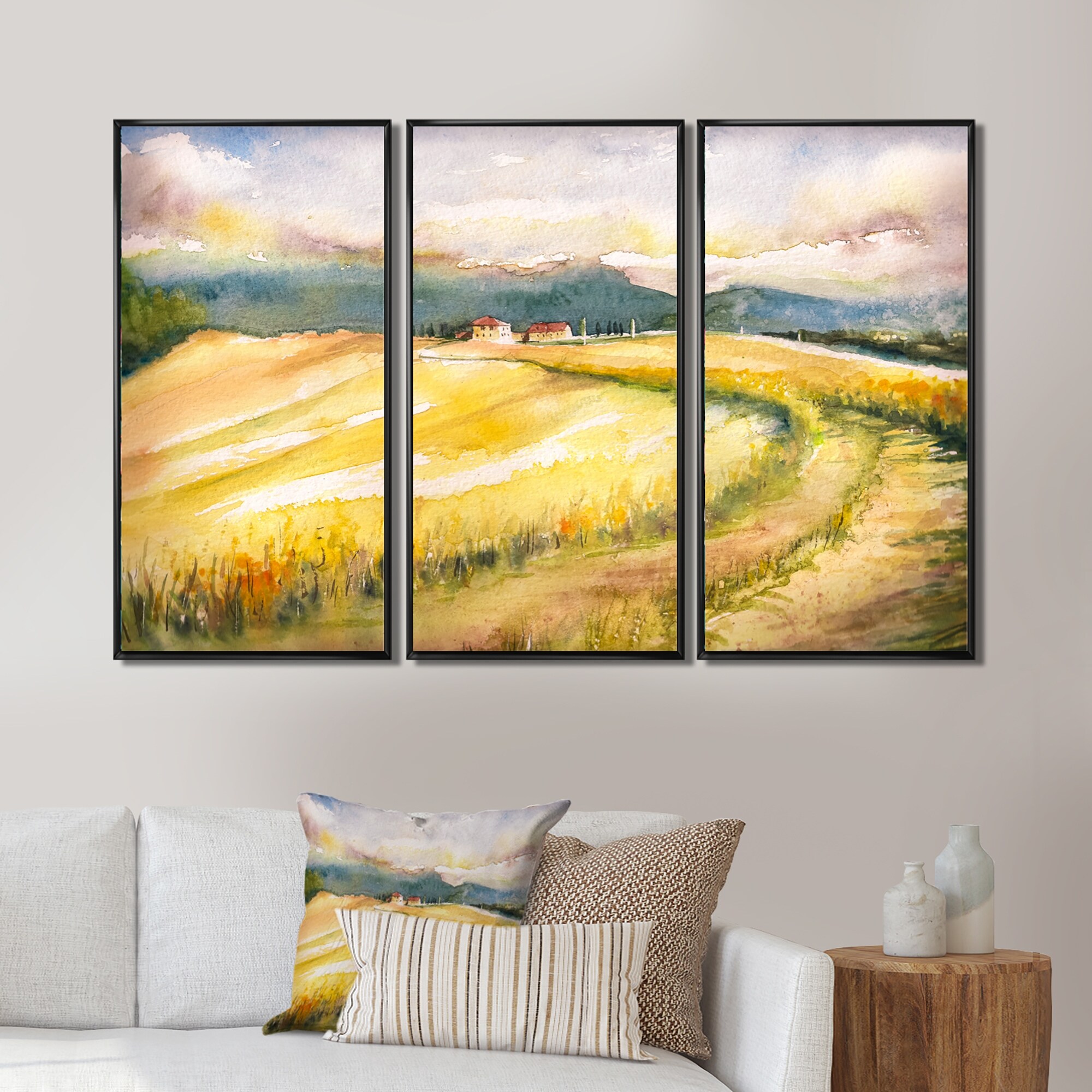 Designart "Golden Fields of Tuscany Italy" Country Framed Canvas Wall Art Print Set of 3 - 4 Colors of Frames