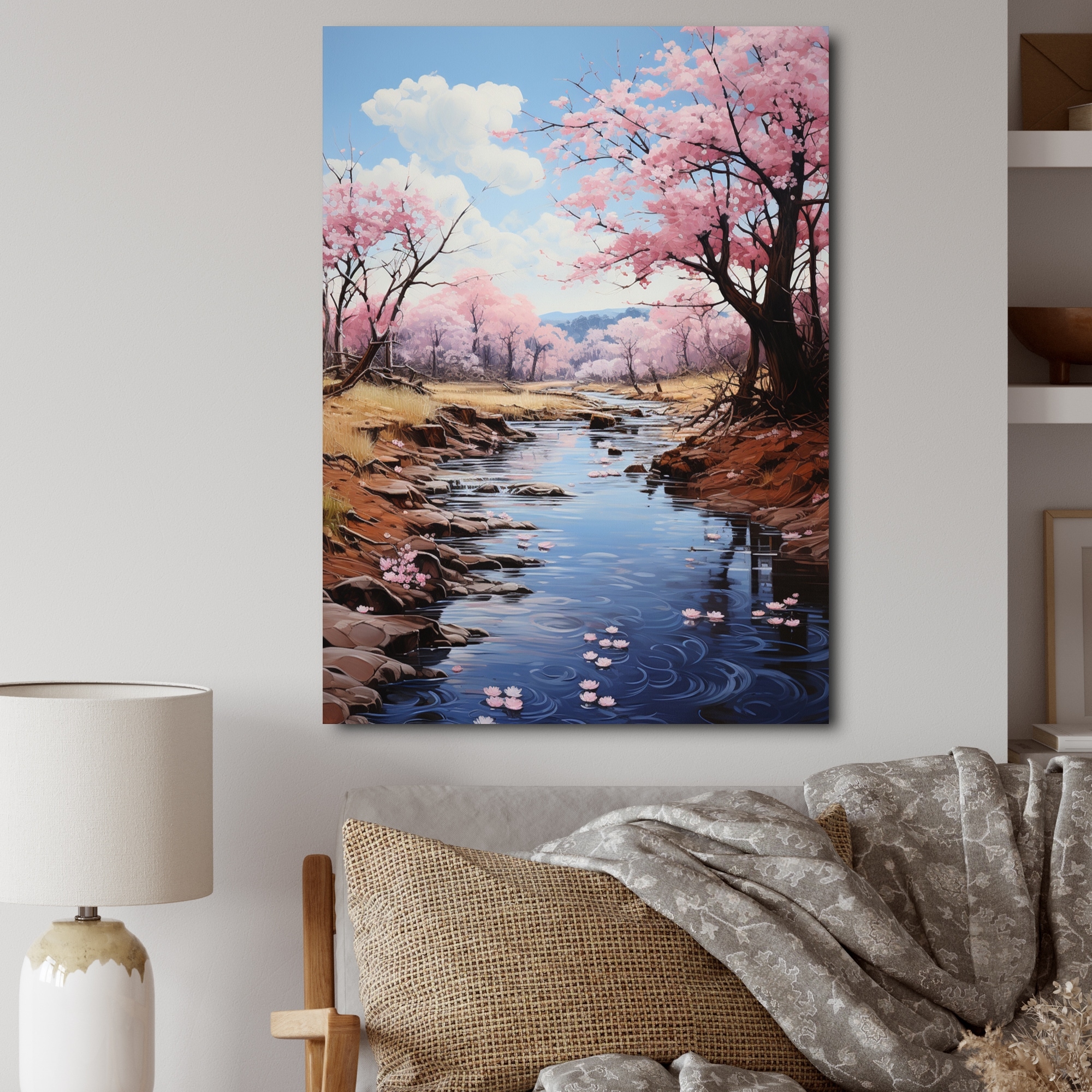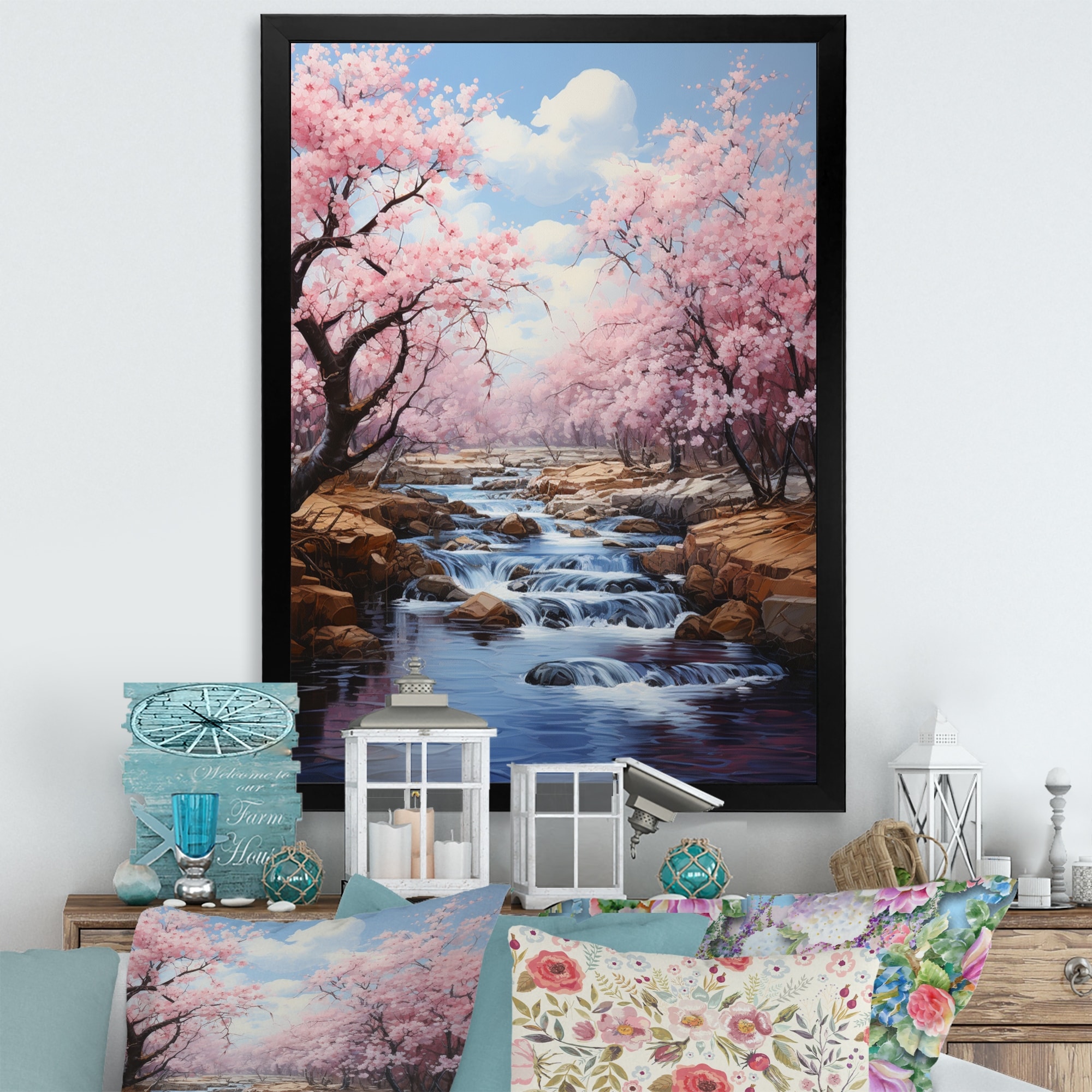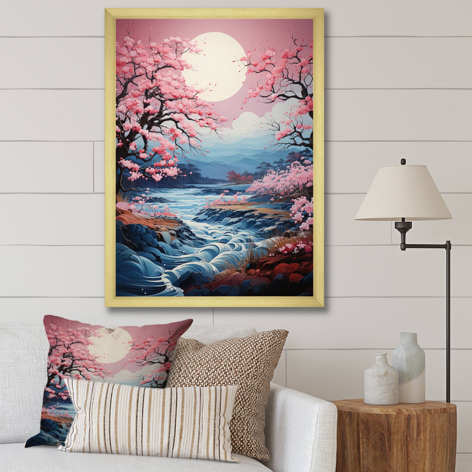 Designart "Japon Art Cherry Blossom River I" Japan Art Framed Wall Art Prints