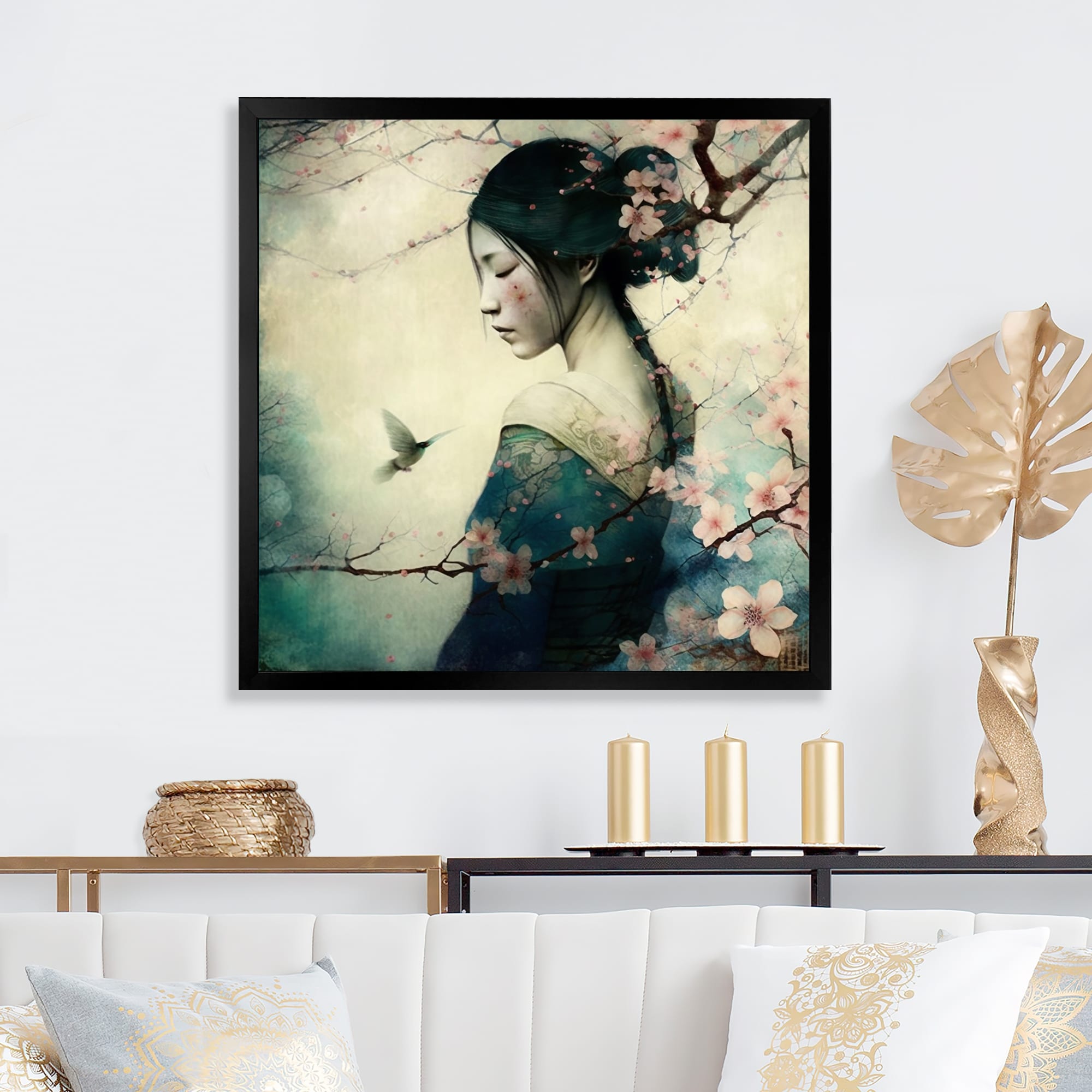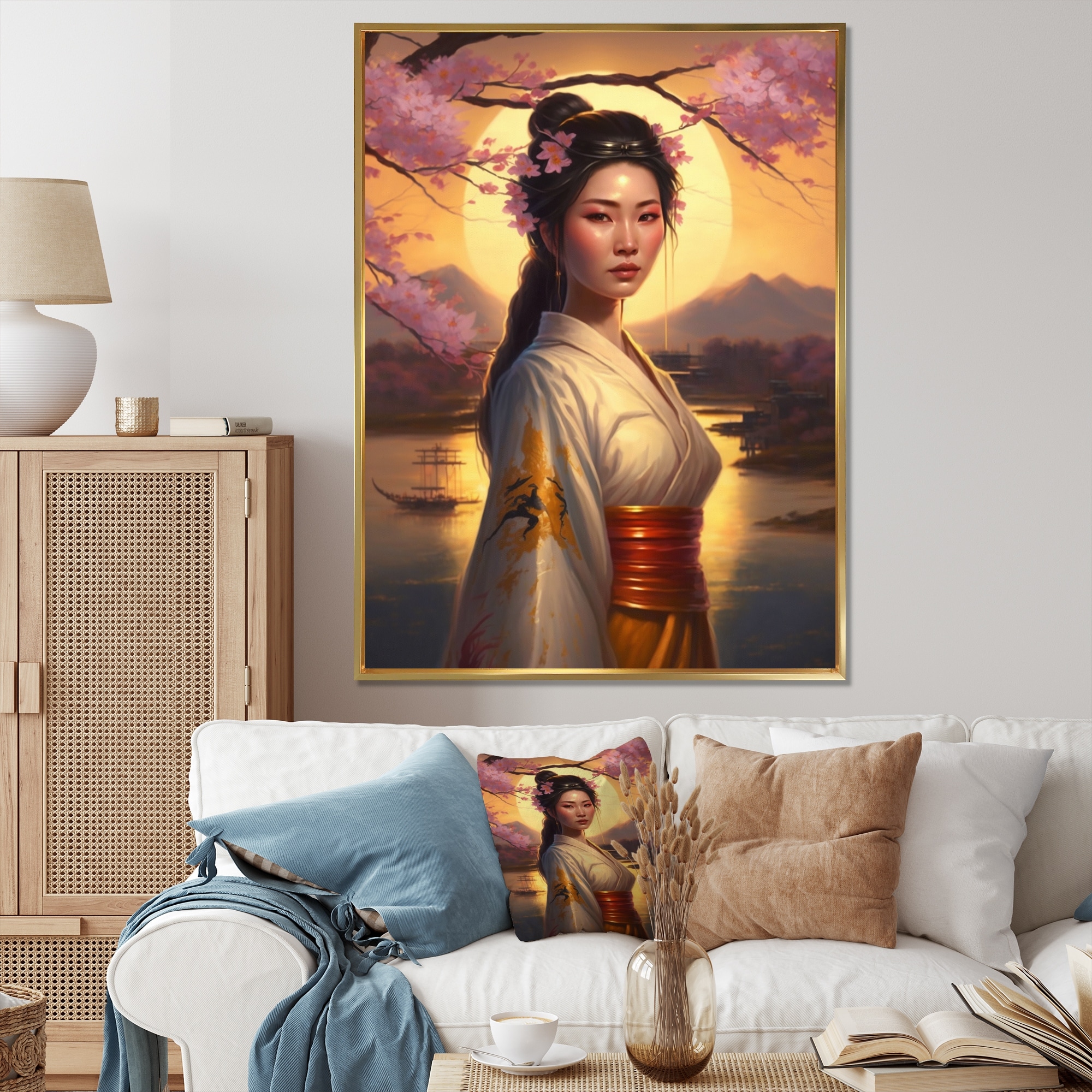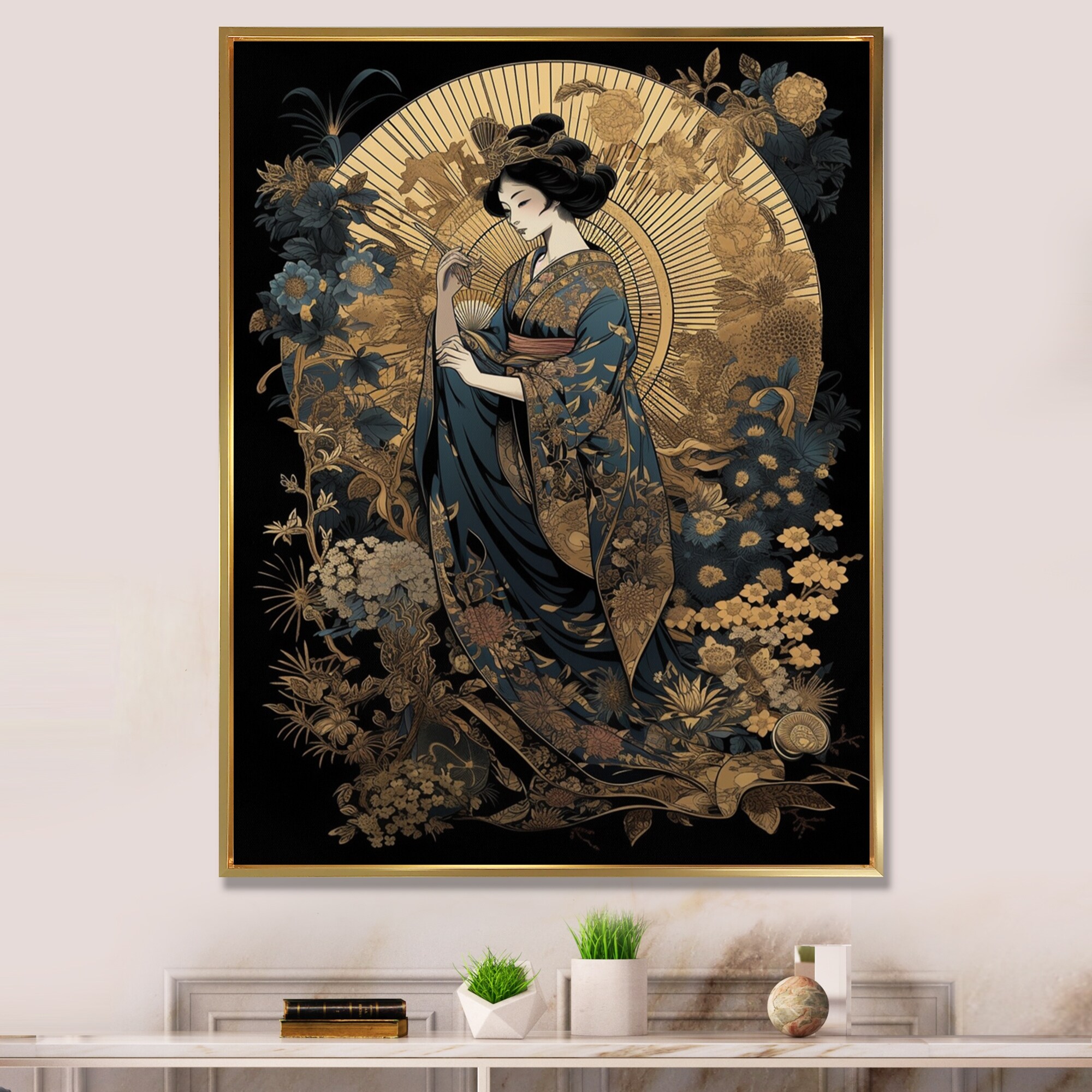 Designart "Japanese Blooming Beauty" Asian Woman Framed Canvas Wall Art