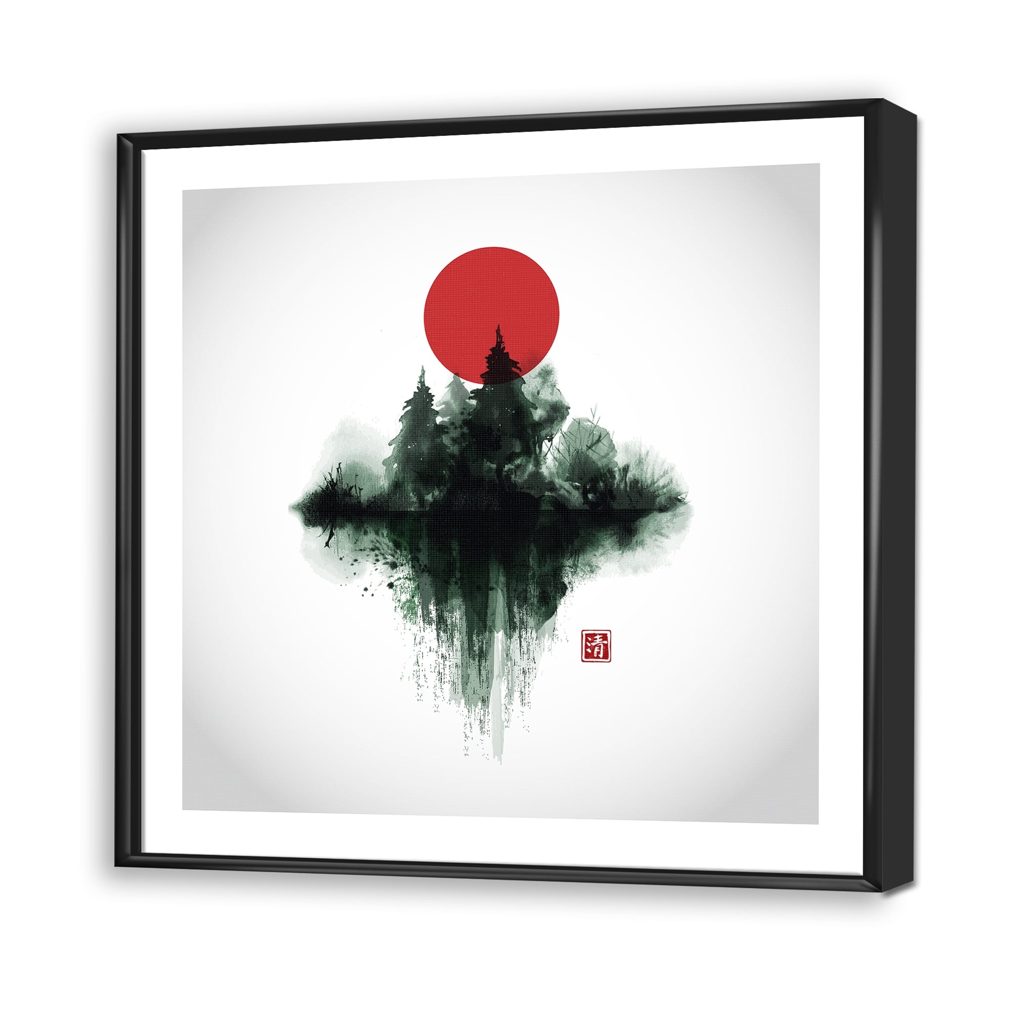 Designart "Japanese Red Moon in Traditional Sumi-e II" Traditional Framed Canvas Wall Art Print