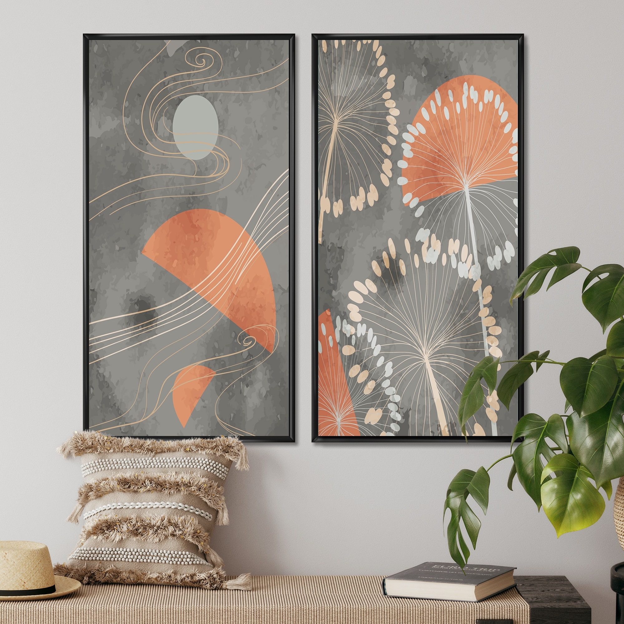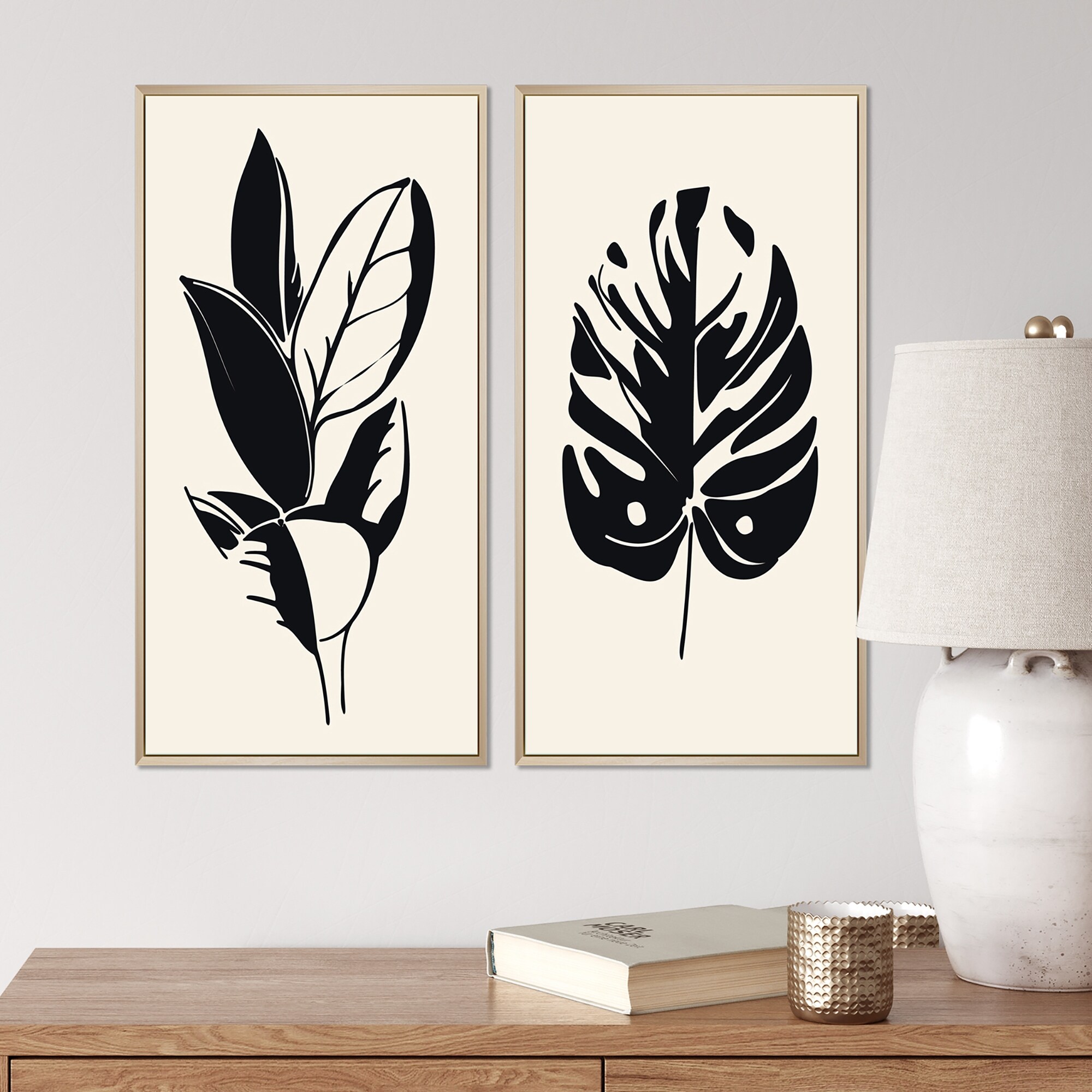 Designart "Japanese Vintage Creative Leaves I" Floral Framed Art Set of 2 Pieces