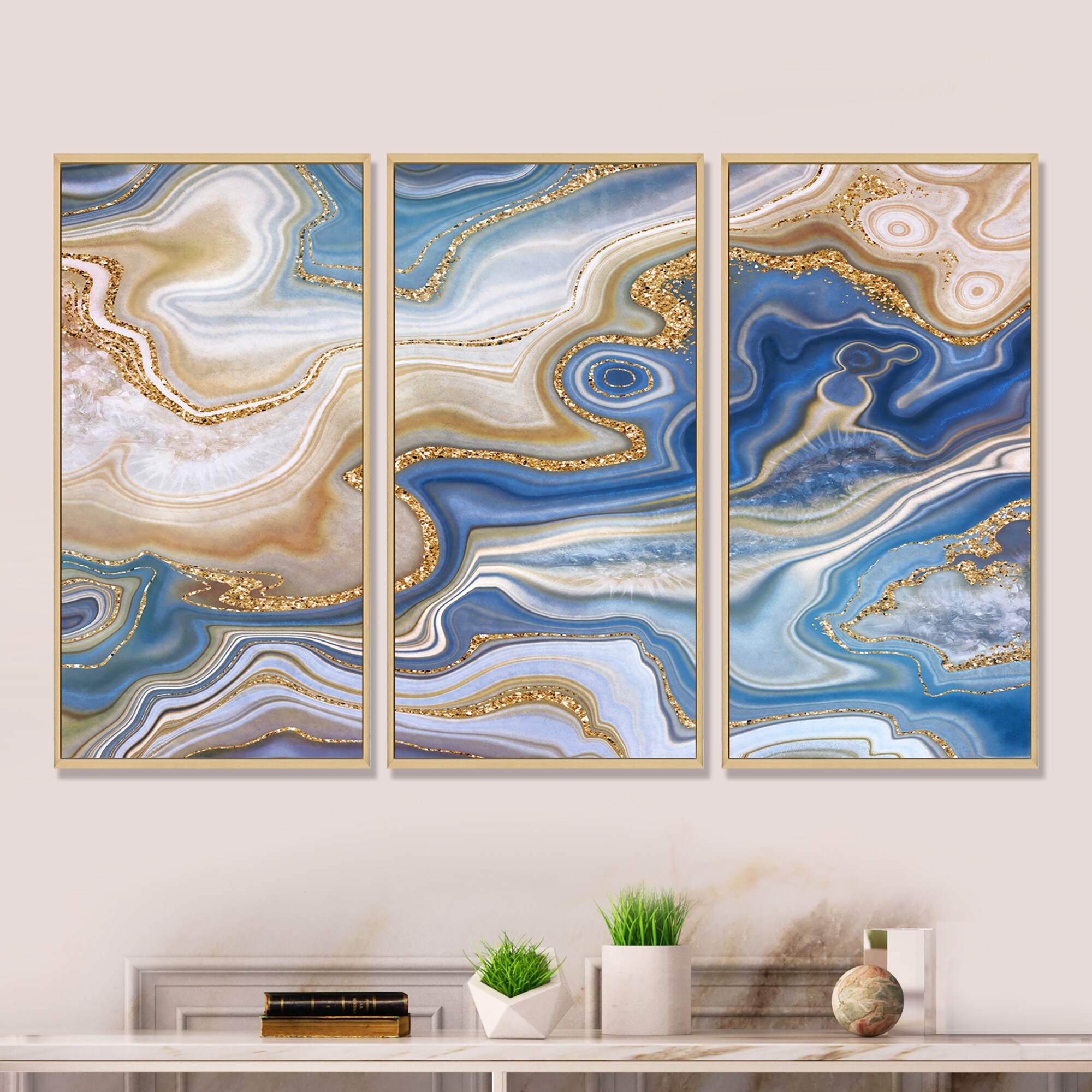 Designart "Ocean Blue Golden Jasper Agate II" Glam Framed Art Prints Set of 3 - 4 Colors of Frames