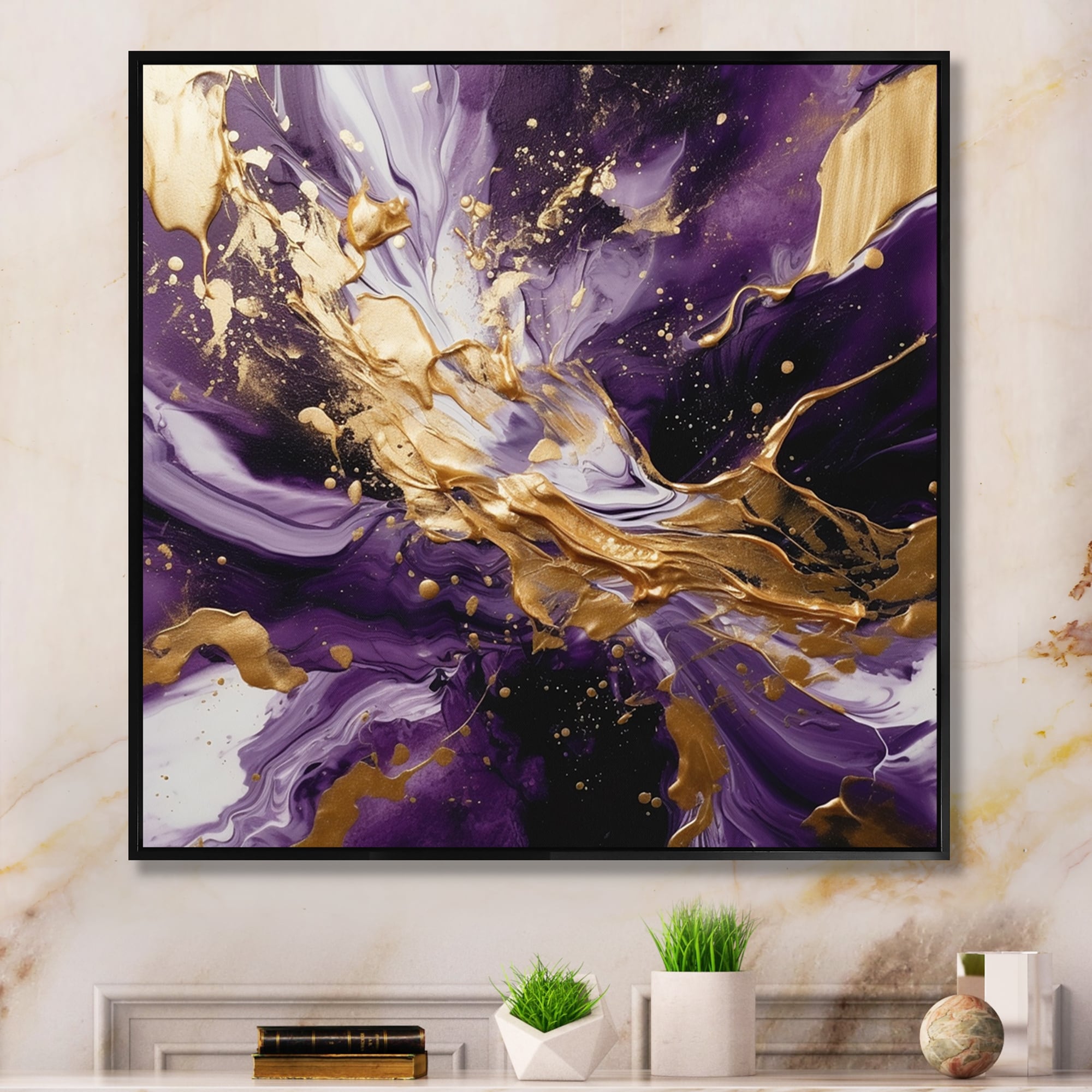 Designart "Purple And Gold Liquid Magic III" Abstract Shapes Framed Wall Art Prints