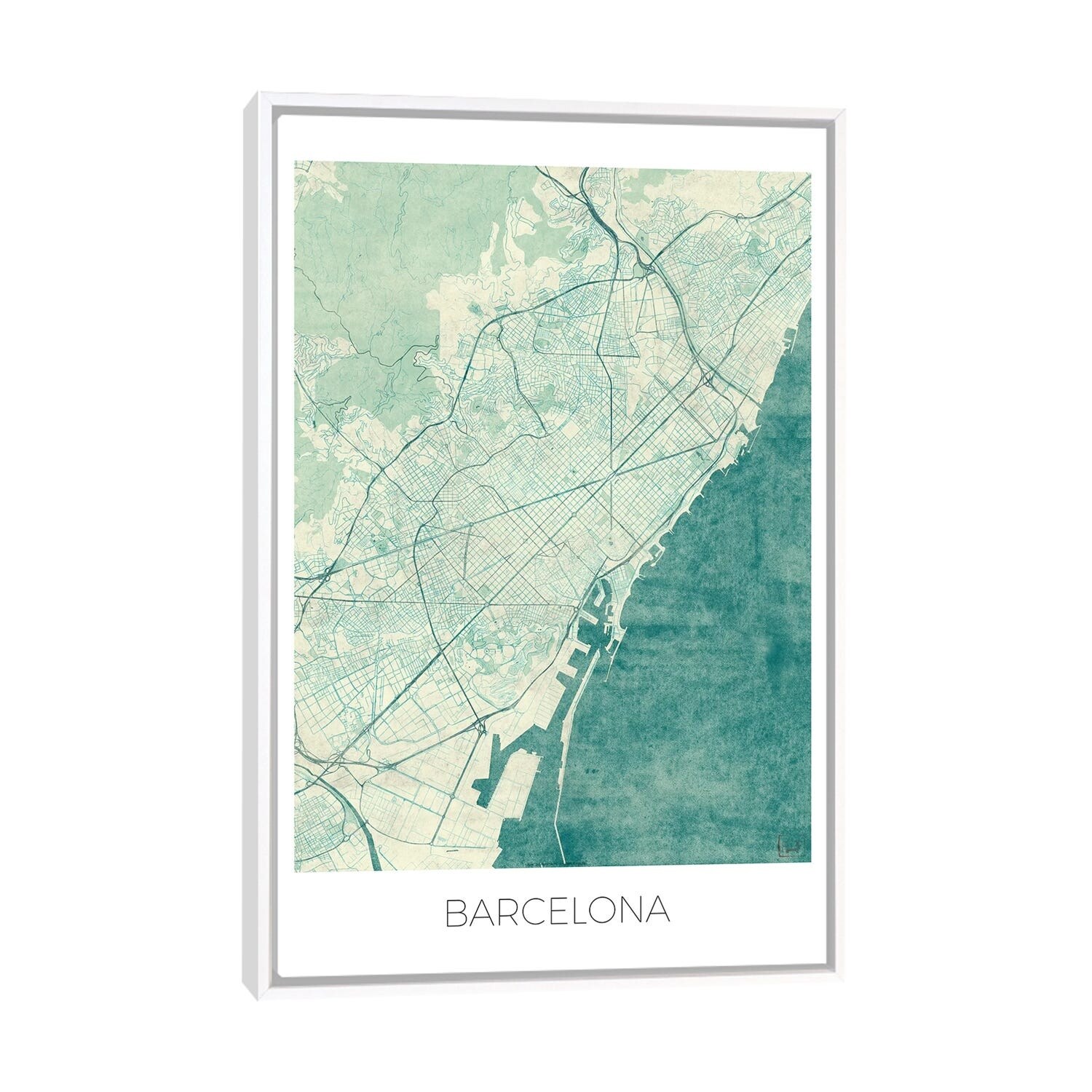 iCanvas "Barcelona Vintage Blue Watercolor Urban Blueprint Map" by Hubert Roguski Framed Canvas Print