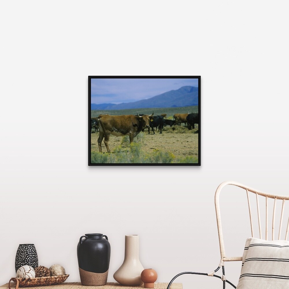 "Herd of cattle in a field, Taos, Taos County, New Mexico" Black Float Frame Canvas Art