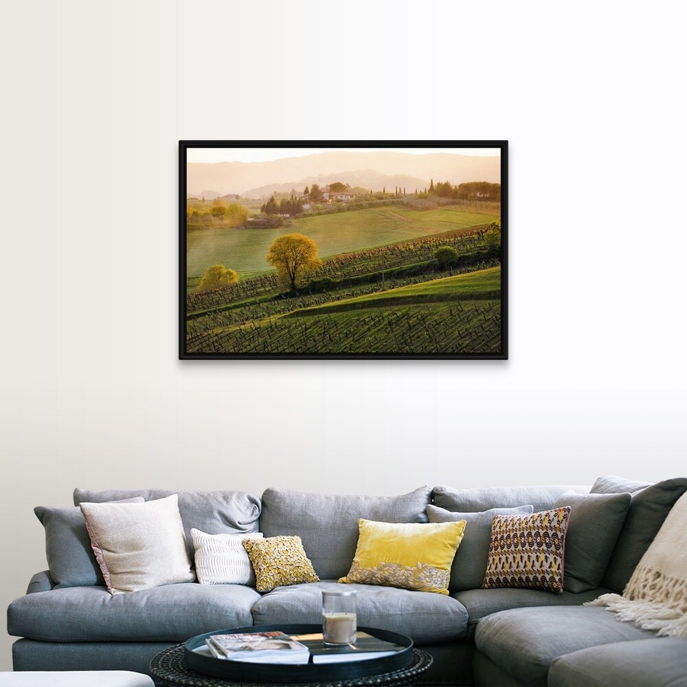 "Sun sets through mist over vineyard in Tuscany." Black Float Frame Canvas Art