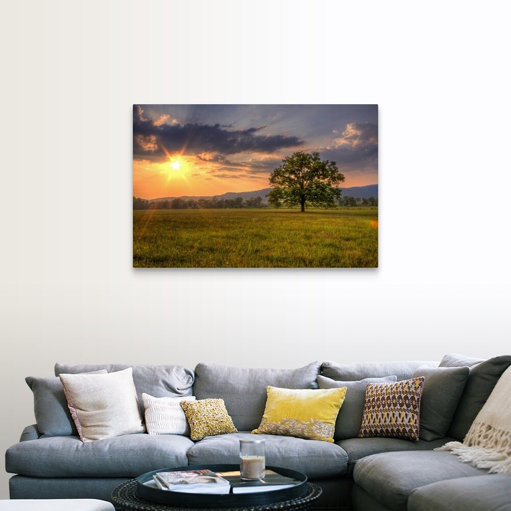 "Sunset behind lone tree in field, Great Smoky Mountains National Park." Canvas Wall Art