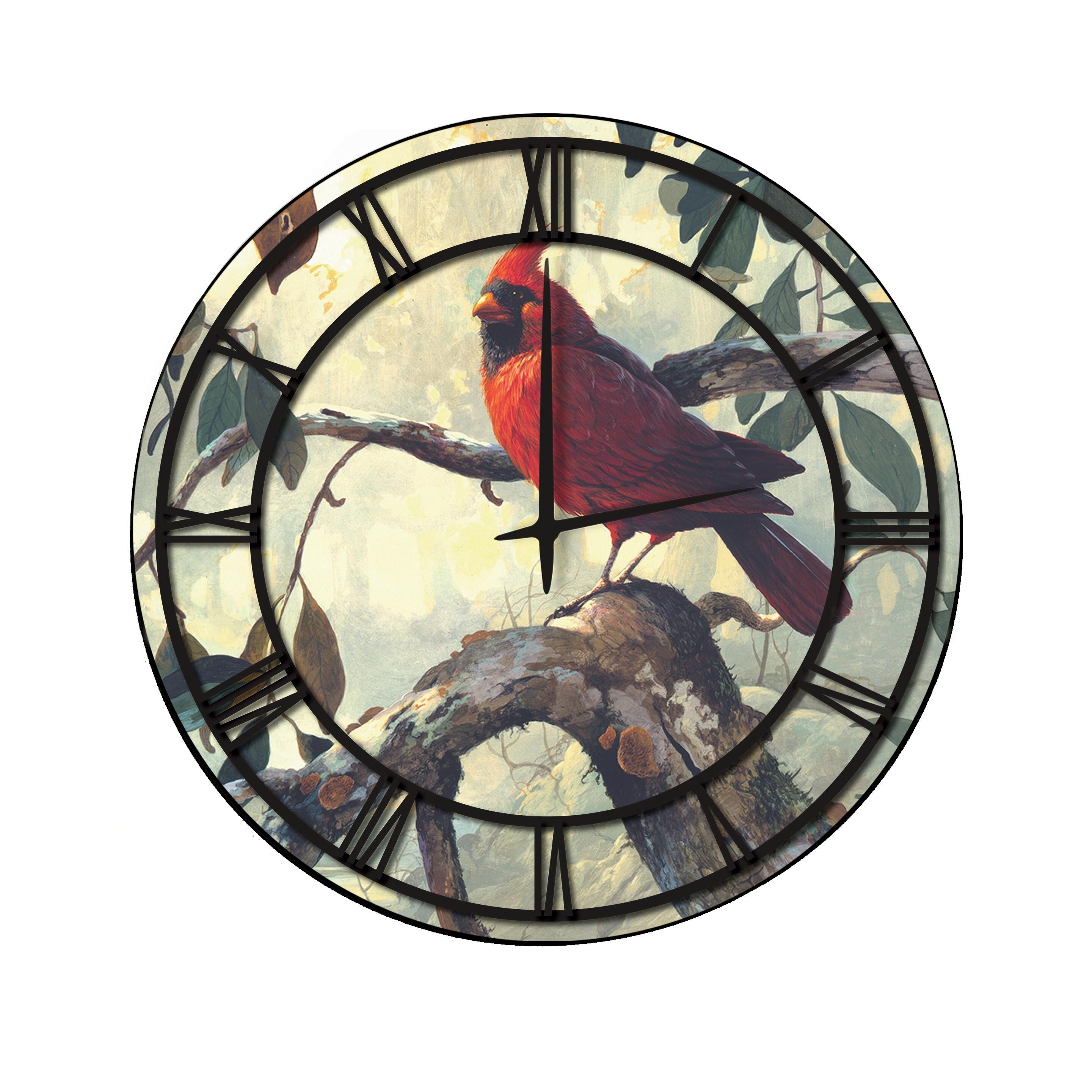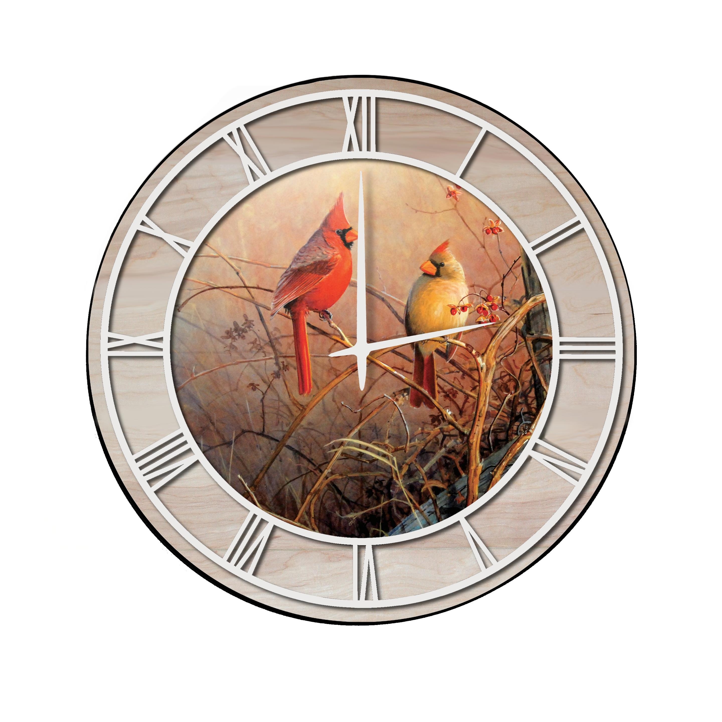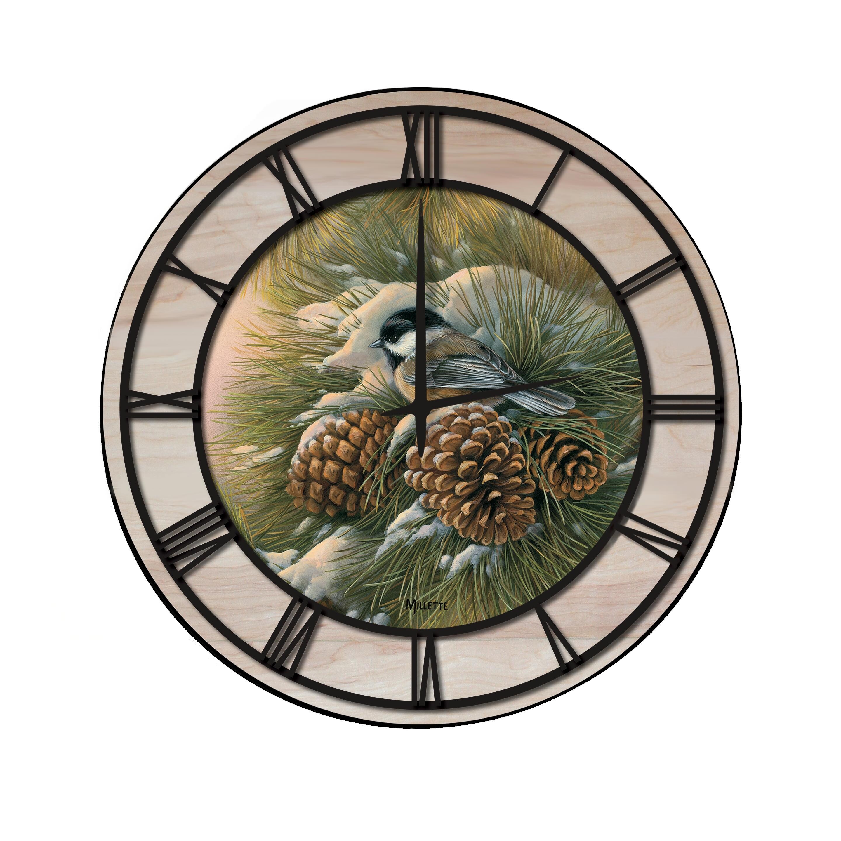 Wall Clock with Natural Woodgrain Accent - December Dawn Chickadee - Black Numbers - 24" x 24"