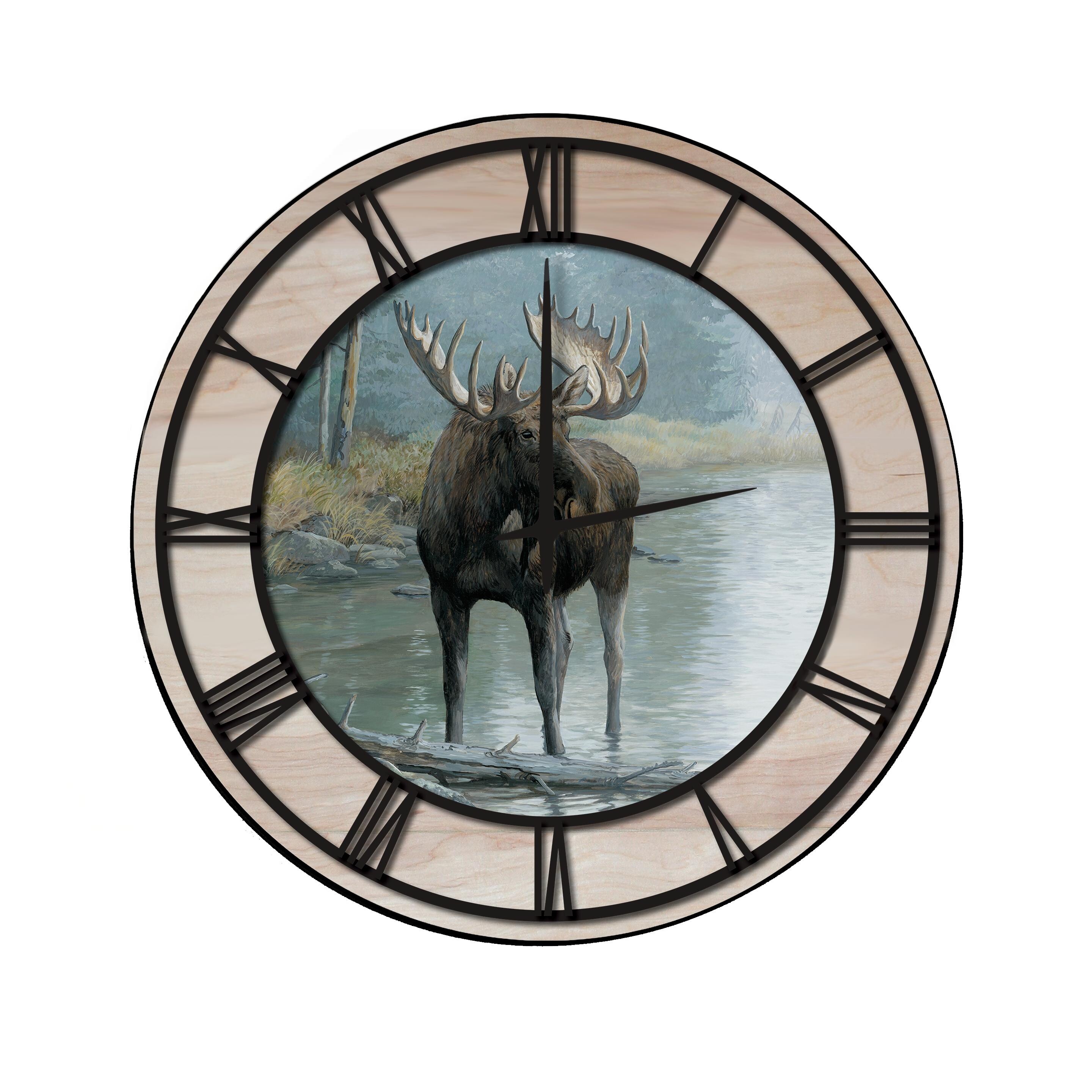 Wall Clock with Natural Woodgrain Accent - Quiet Water Moose - Black Numbers - 24" x 24"