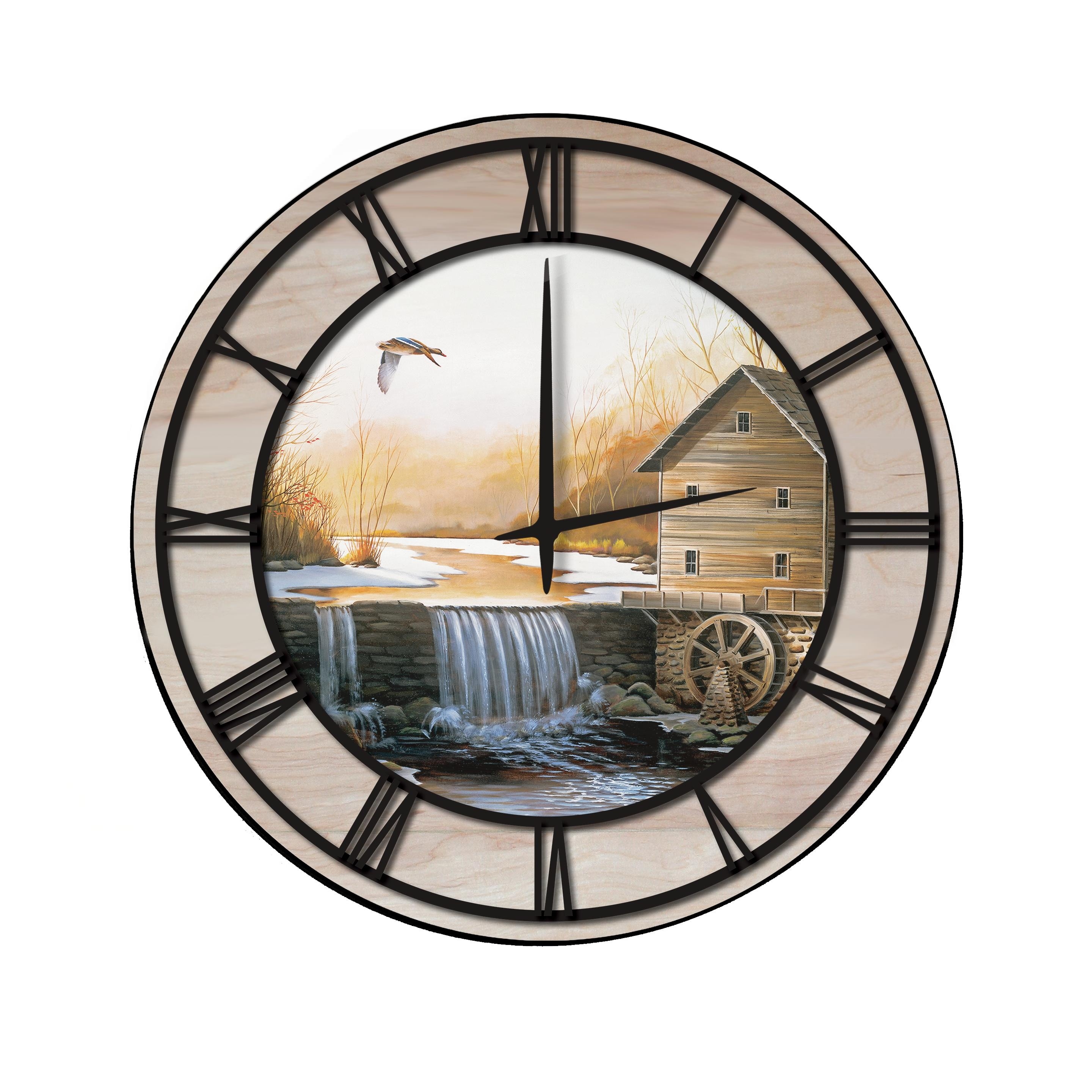 Wall Clock with Natural Woodgrain Accent - The Old Mill - Black Numbers - 24" x 24"