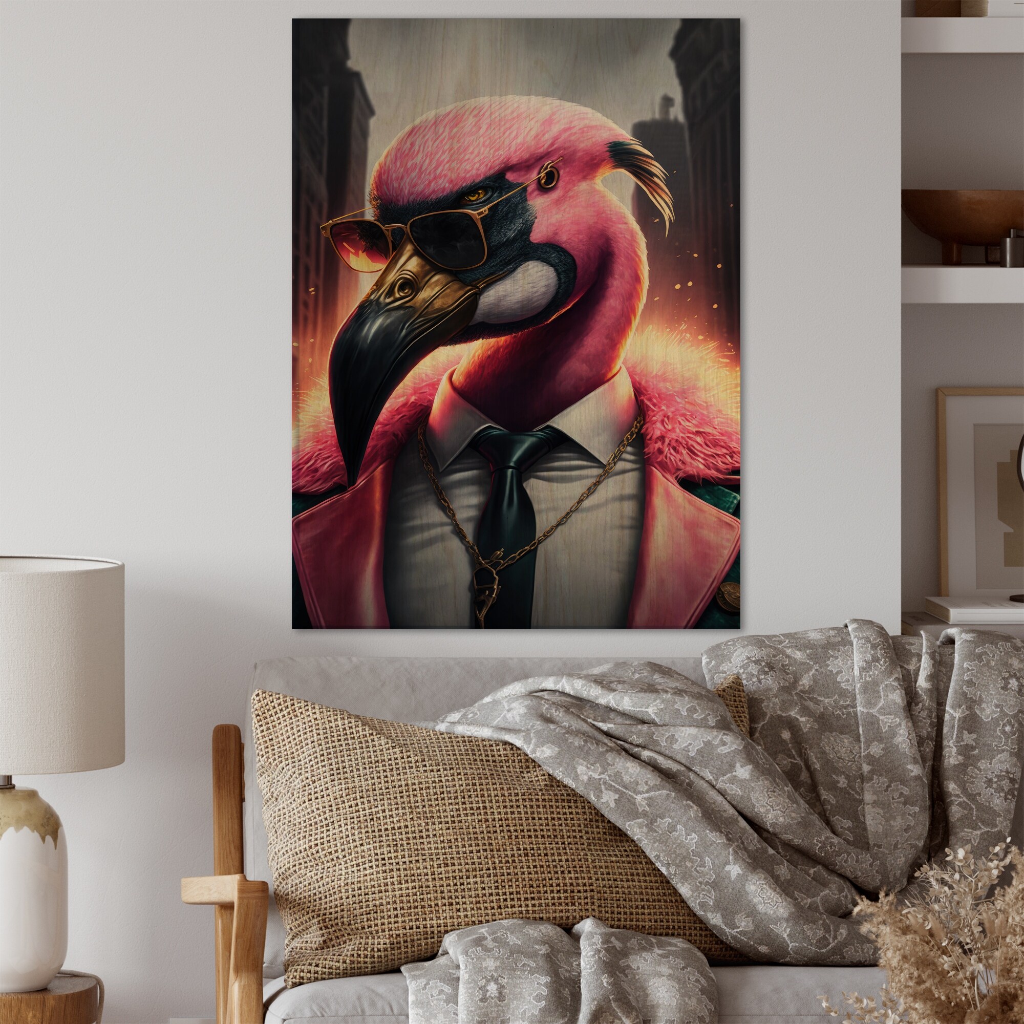 Designart 'Flamingo Gangster in NYC II' Animals Flamingo Wood Wall Art - Natural Pine Wood