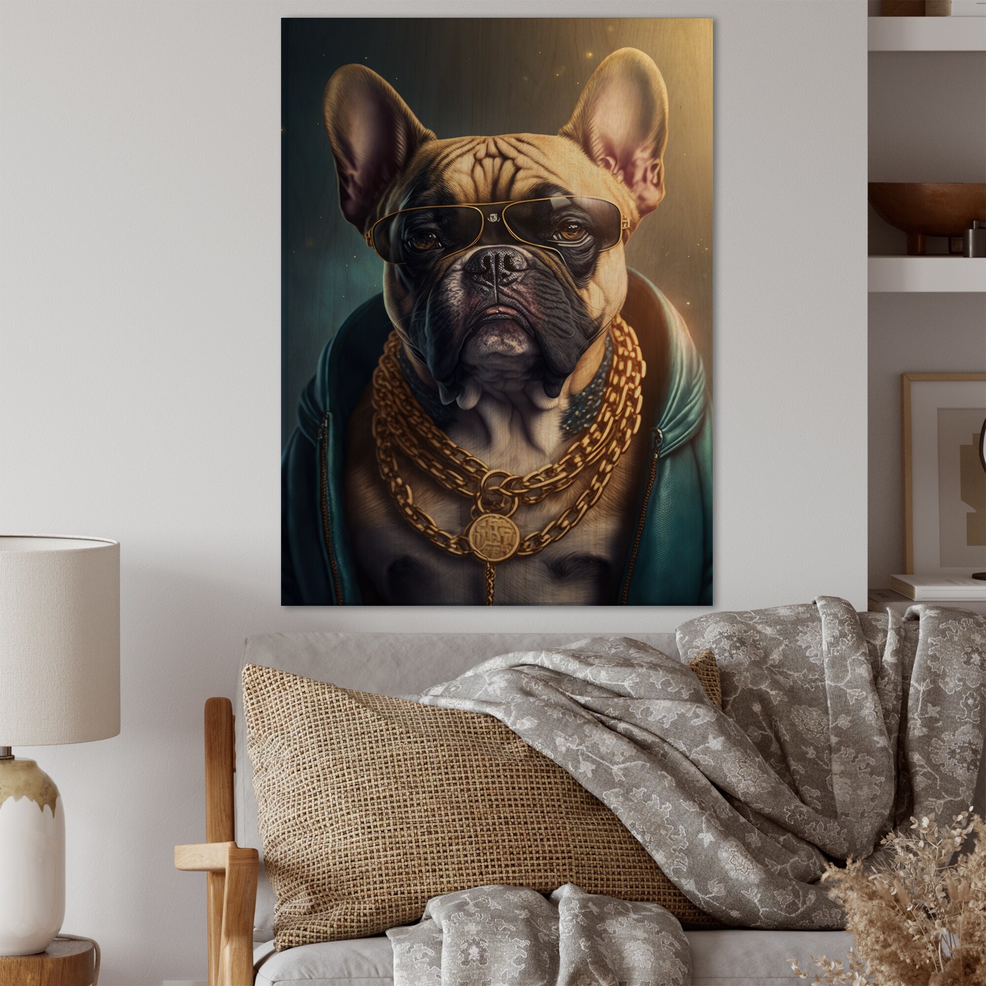 Designart 'Frenchie Gangster in NYC IV' Animals Dog Wood Wall Art - Natural Pine Wood