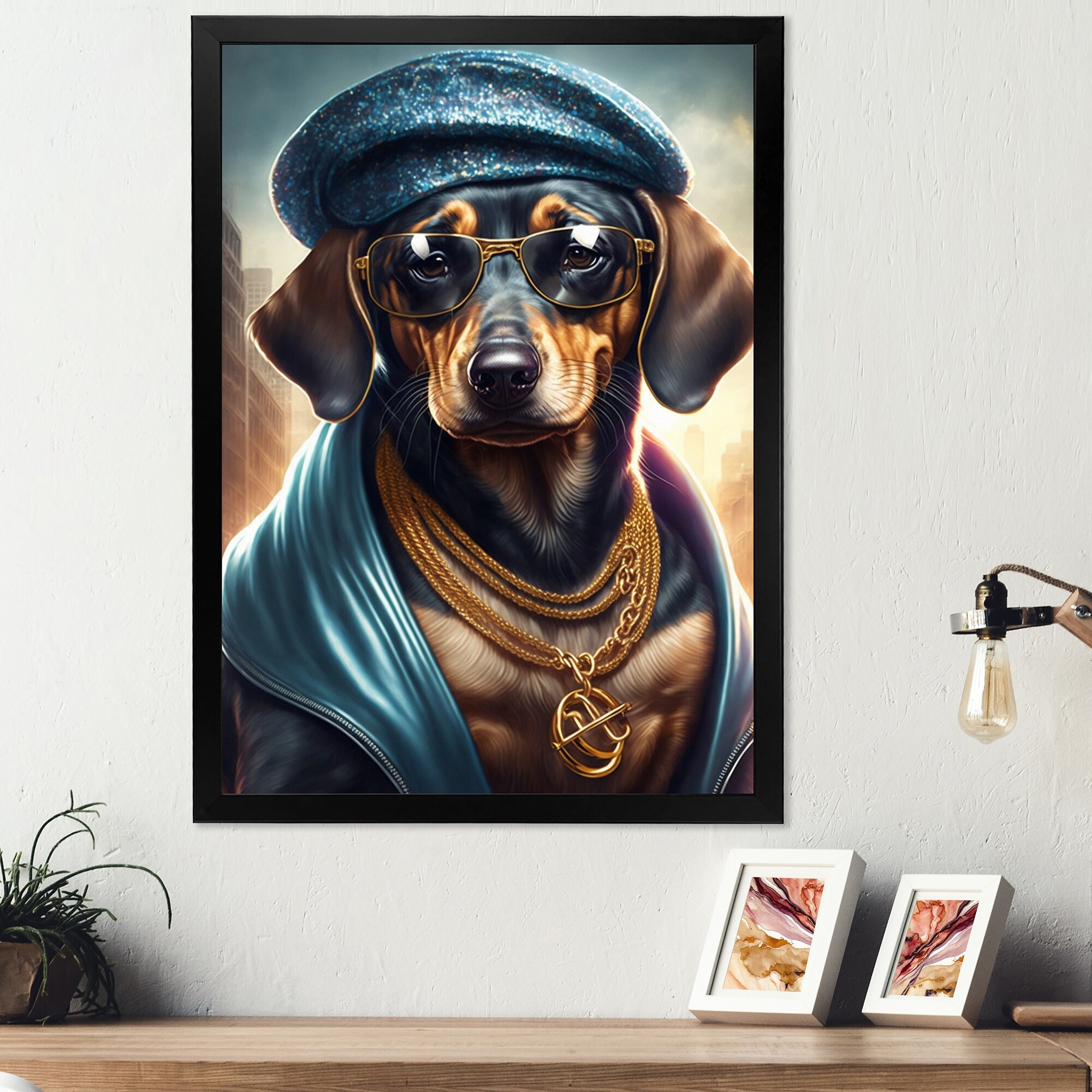 Designart "Dachshund Gangster in NYC III" Animals Framed Art Print