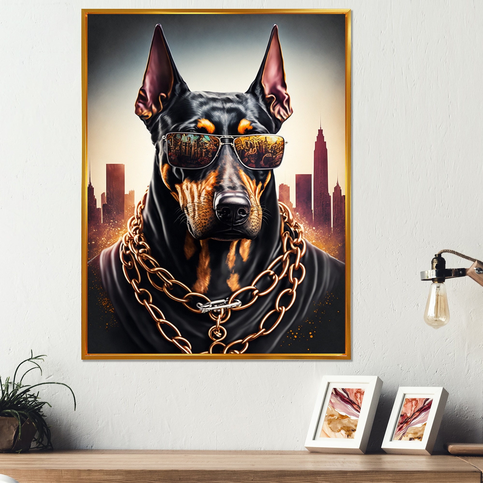 Designart "Doberman Gangster in NYC II" Animals Framed Canvas Art Print