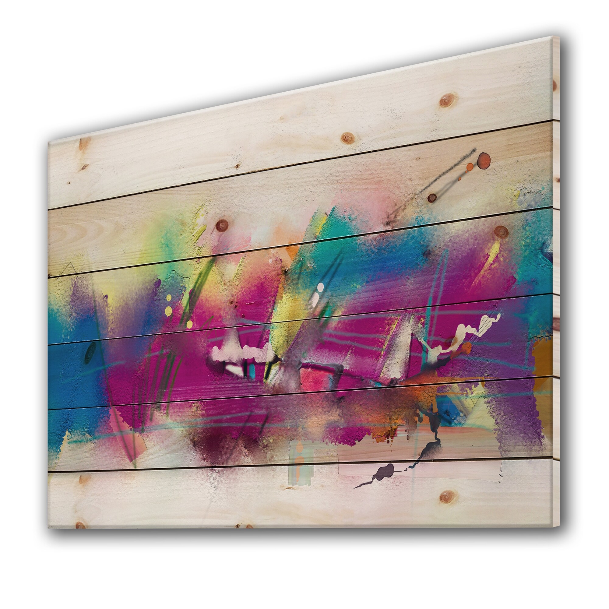 Designart 'Violet Oasis With Clouds of Turquoise And Tellow Hand Drawn Brush Strokes' Modern Print on Natural Pine Wood
