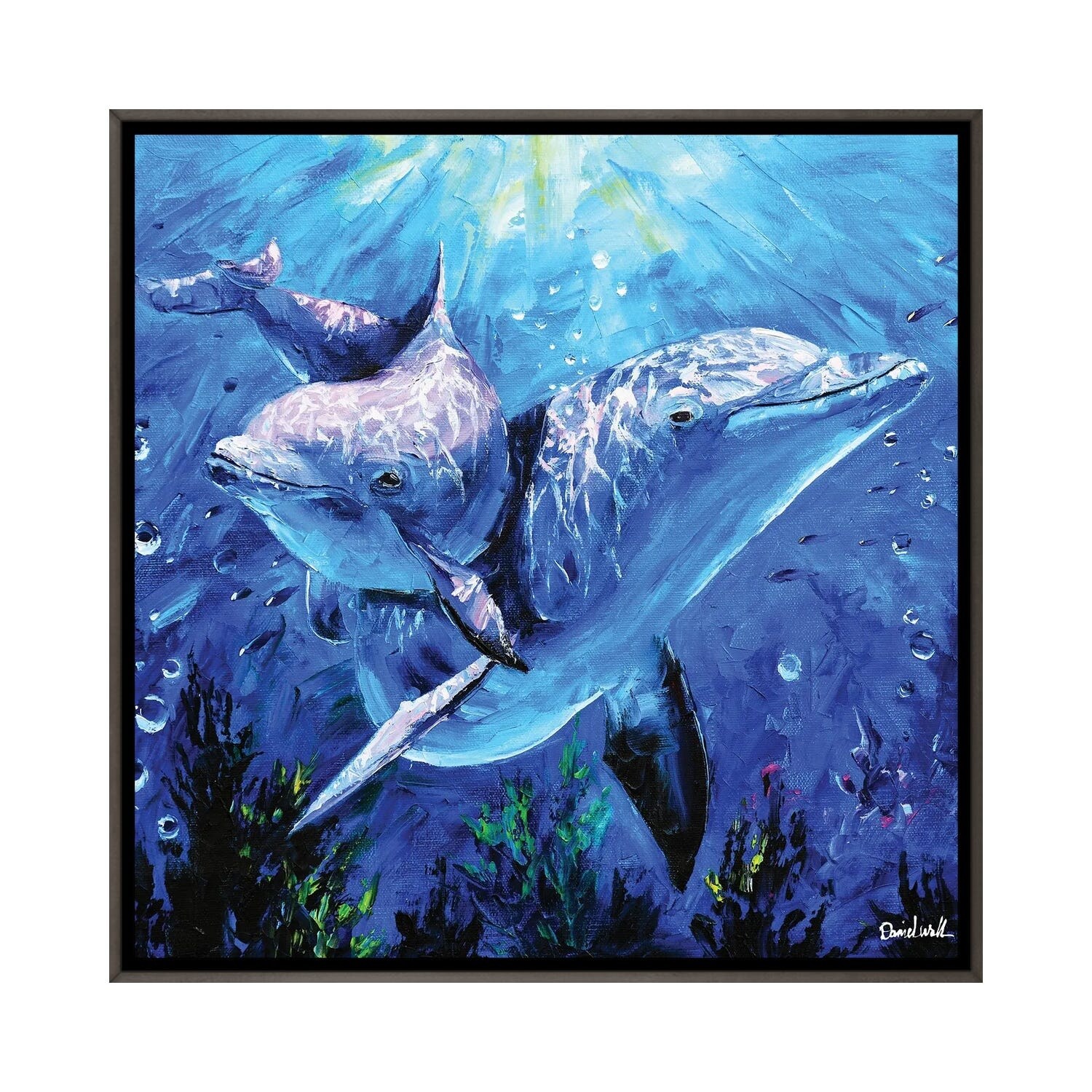 Designart "Grey Blue Dolphin Oceanic Elegance II" Marine Animals Framed Canvas Wall Art