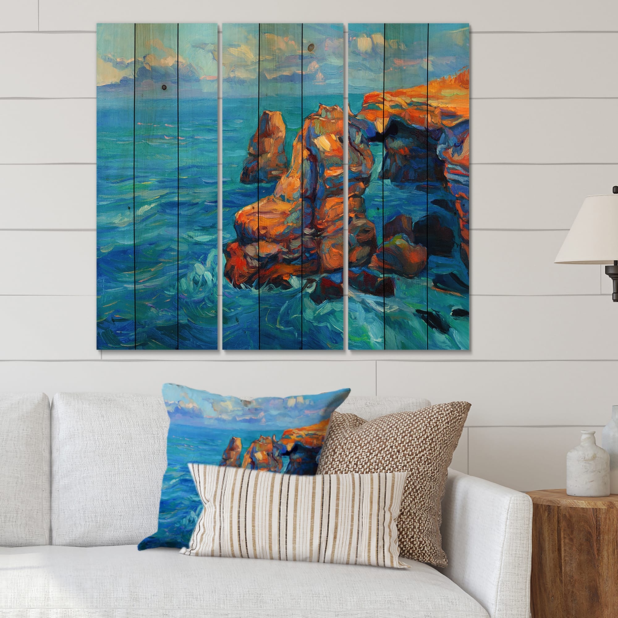Designart 'Cliffs By the Blue Ocean' Nautical & Coastal Print on Natural Pine Wood - 3 Panels