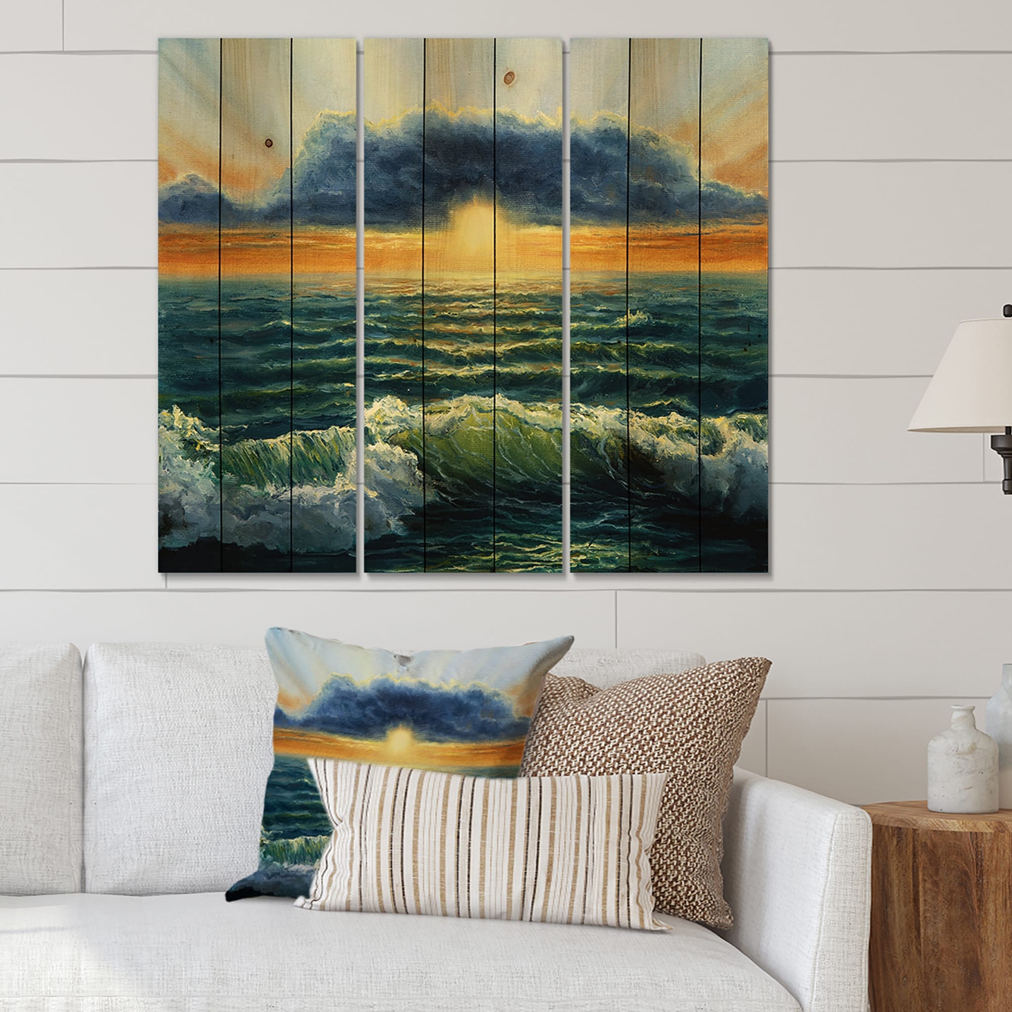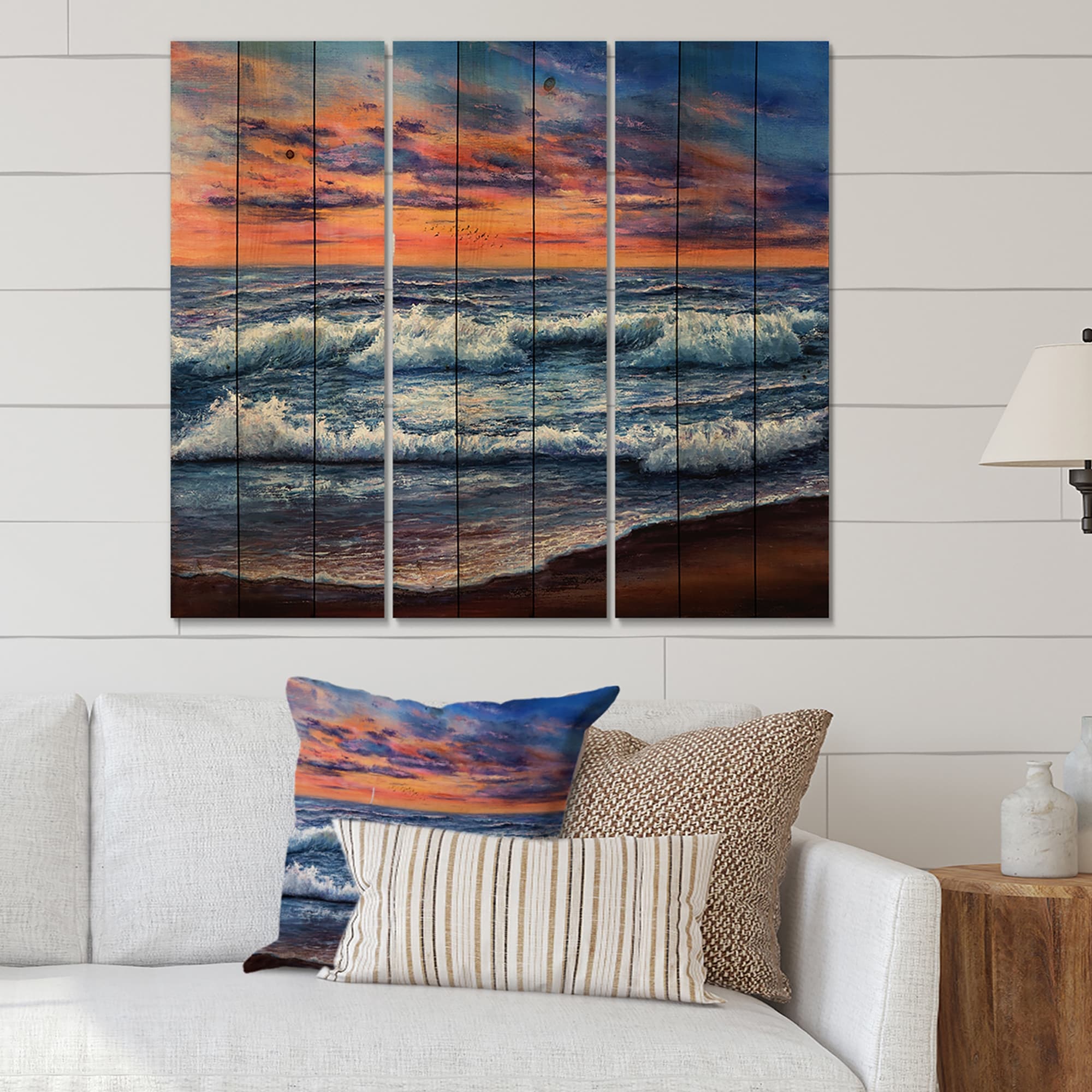 Designart 'Sunset Over the Blue Ocean II' Nautical & Coastal Print on Natural Pine Wood - 3 Panels