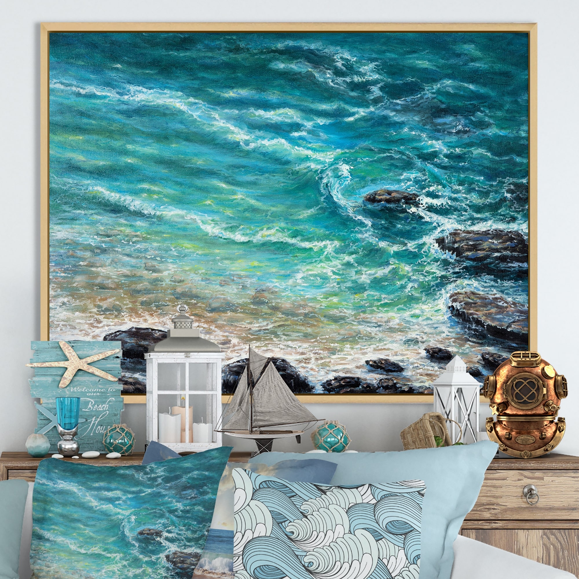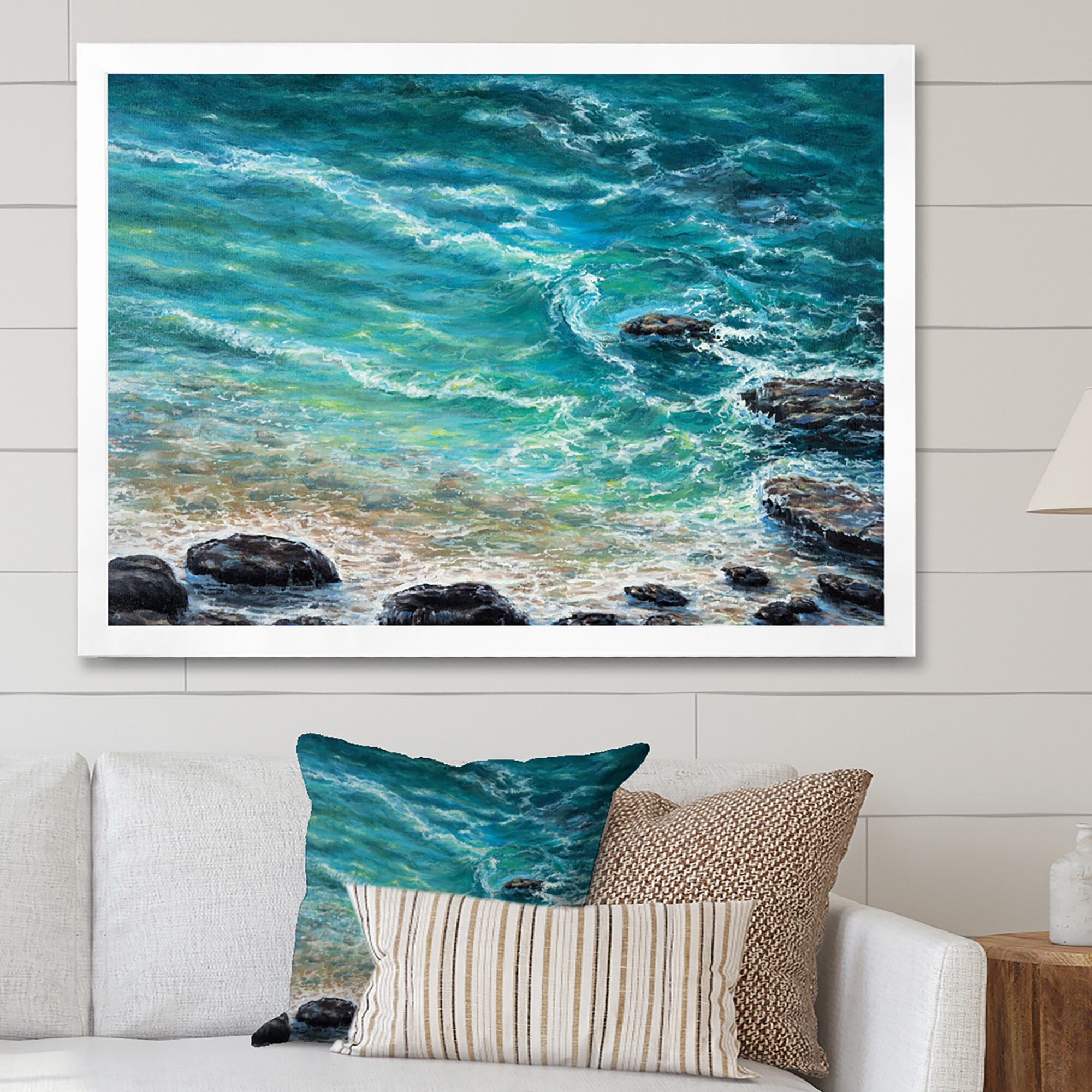 Designart "Wild Blue Ocean Waves V" Nautical & Coastal Framed Canvas Wall Art Print