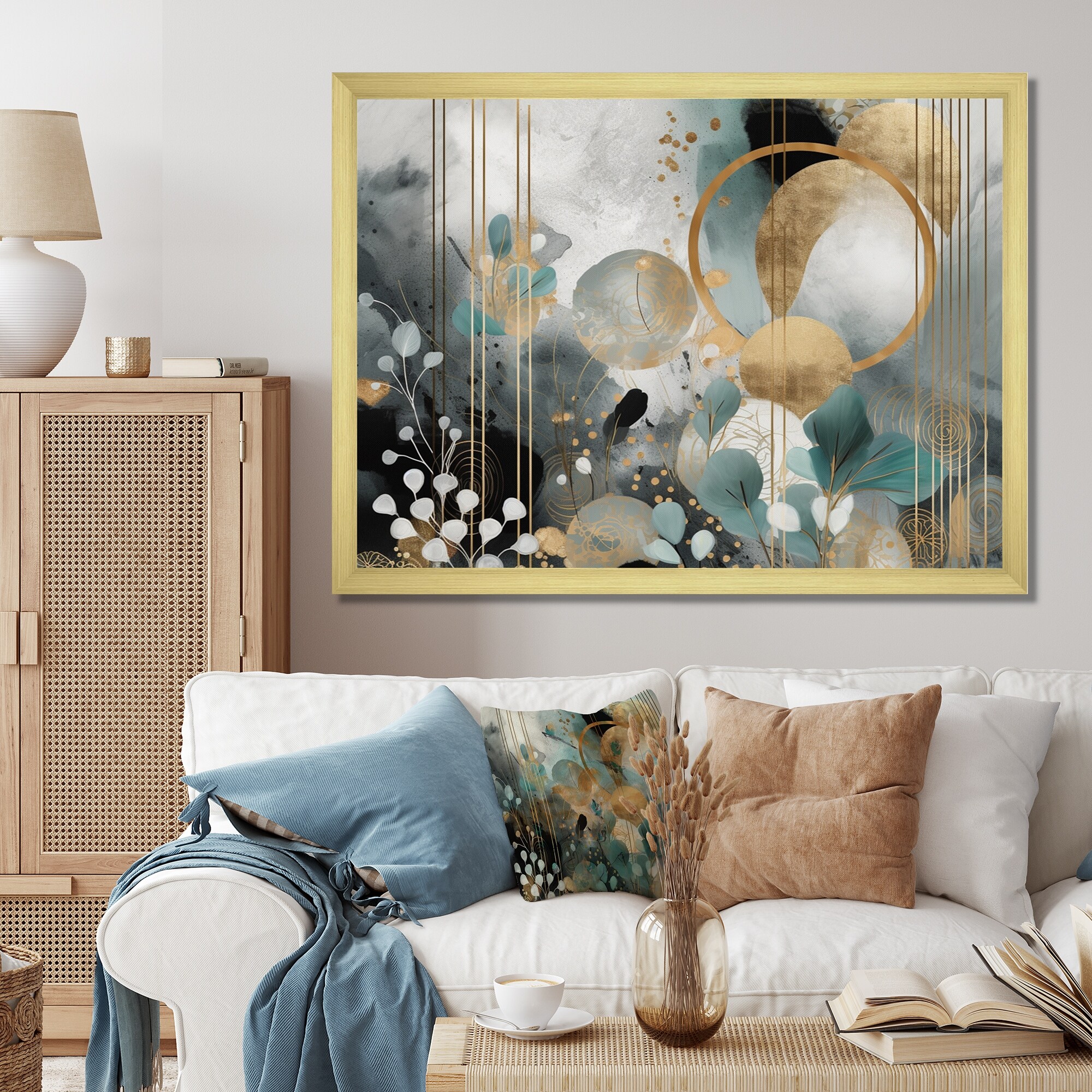 Designart "Golden Blue Marble Flower Design I" Floral Framed Wall Art for Living Room