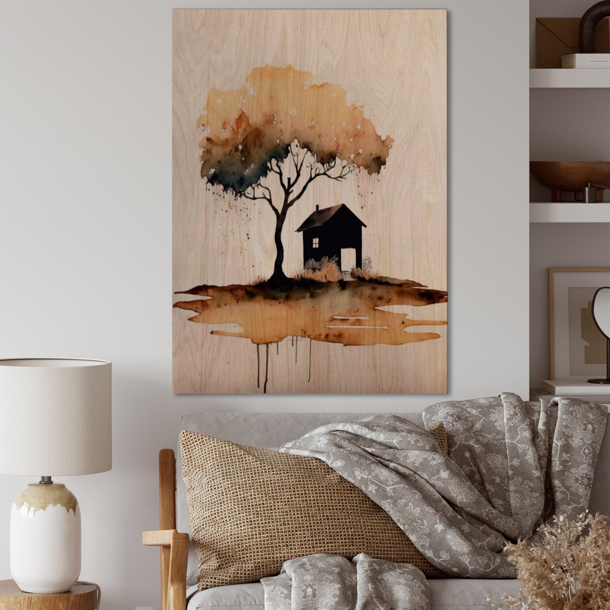 Designart 'Lonely Autumn Watercolor Tree II' Landscape Forest Wood Wall Art - Natural Pine Wood