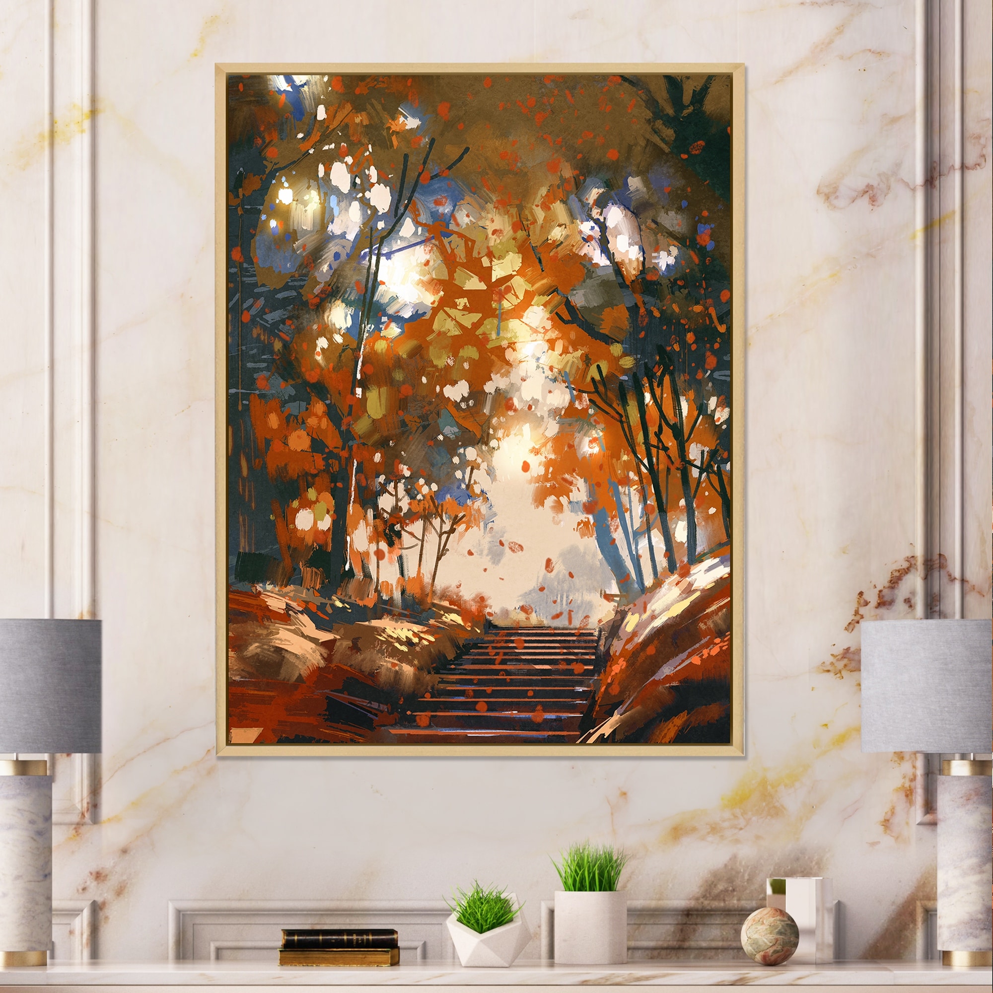 Designart "Stairs With Trees in the Park" Traditional Framed Canvas Wall Art Print