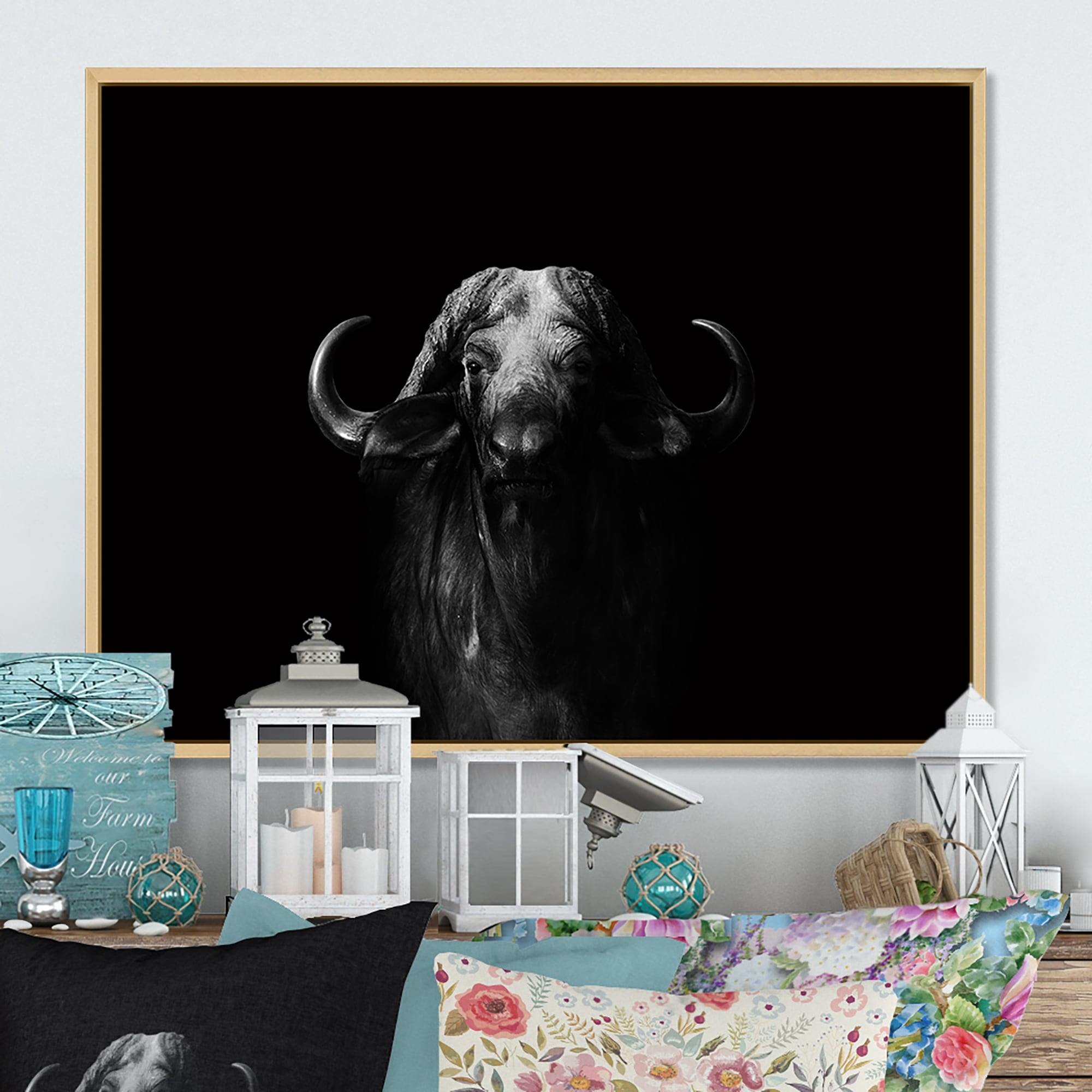 Designart "Buffalo In Black And White" Traditional Framed Canvas Wall Art