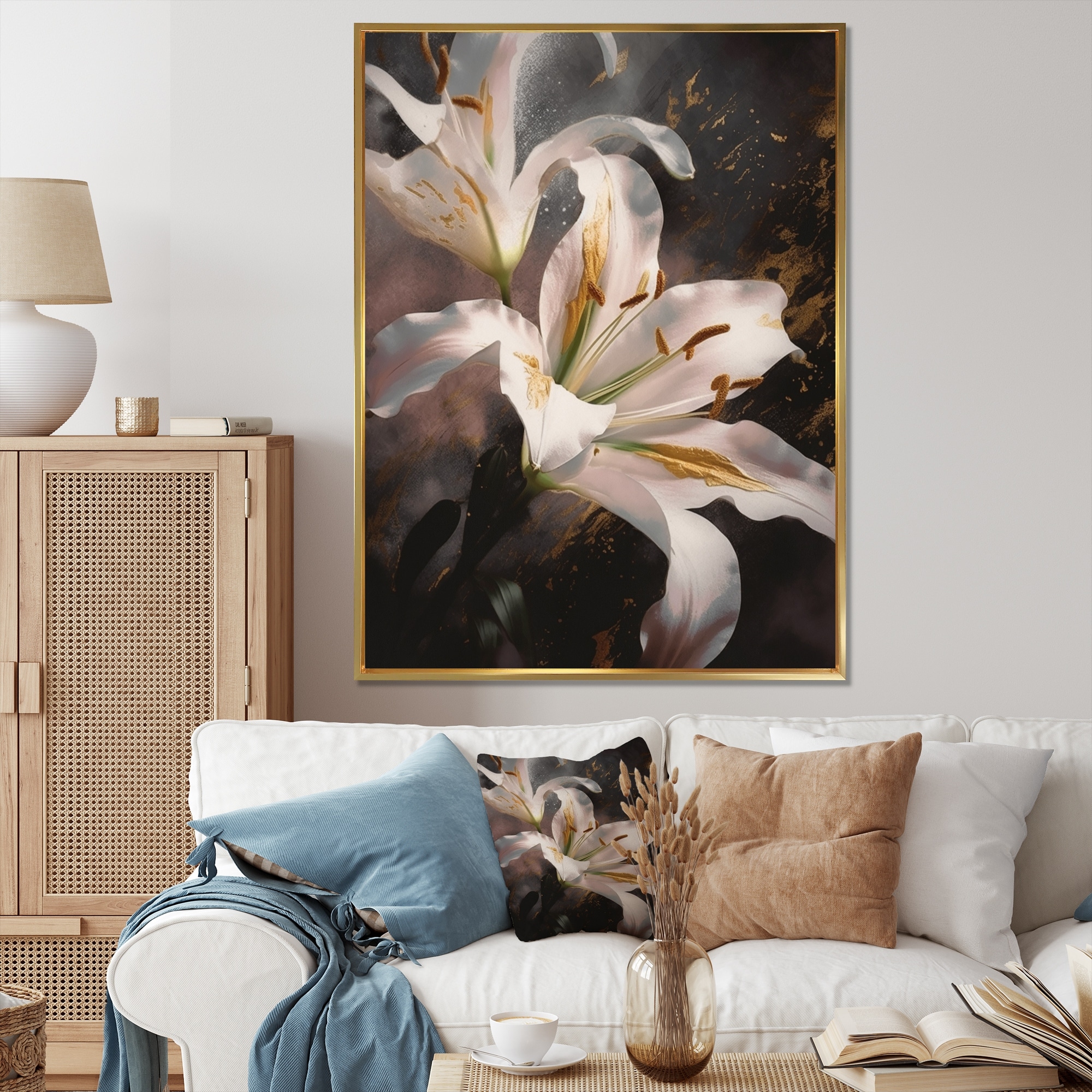 Designart "White Graceful Lilies Ii" Floral Lily Framed Wall Art for Living Room