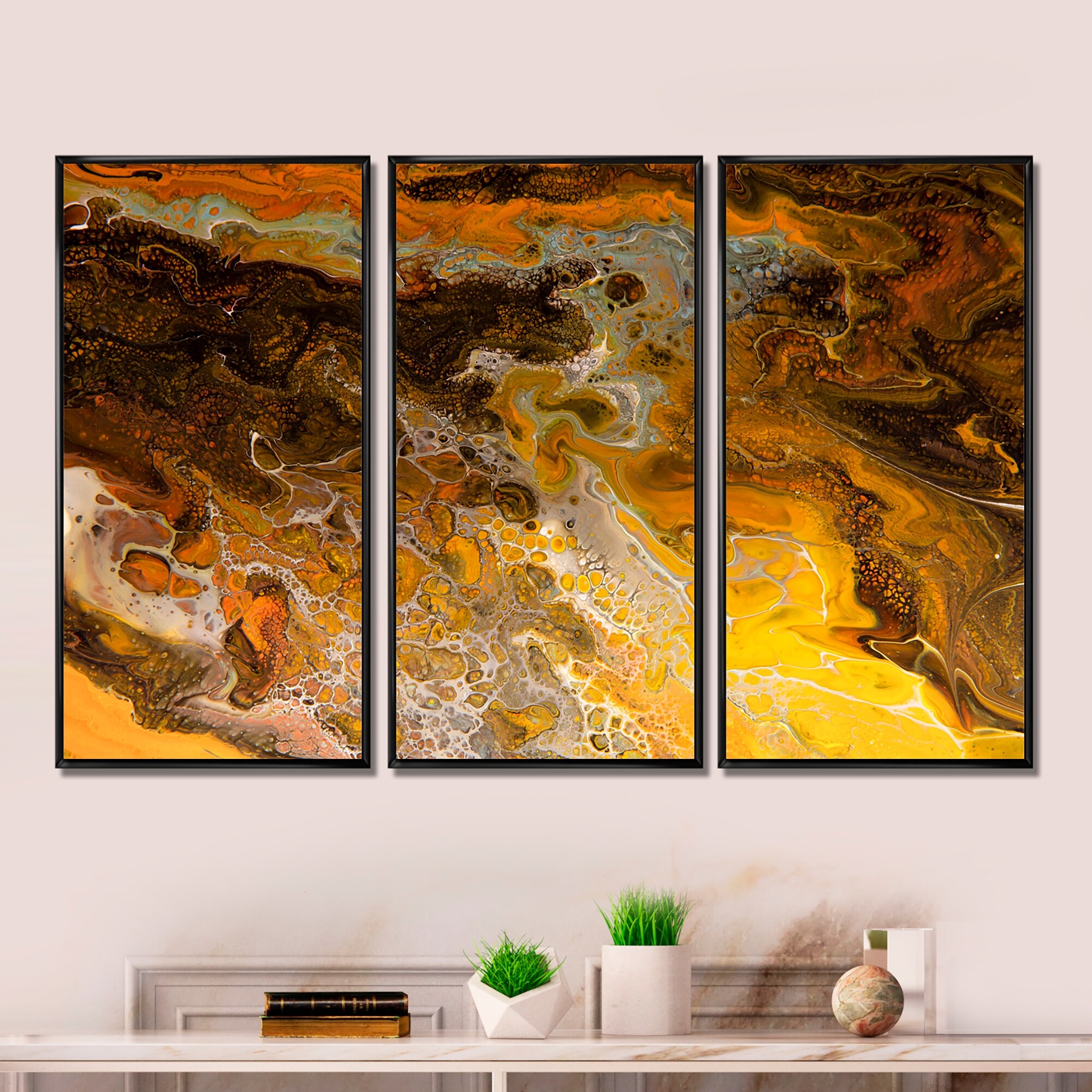 Designart "Yellow Black And Orange Abstract Marble" Modern Framed Wall Art Set of 3 - 4 Colors of Frames