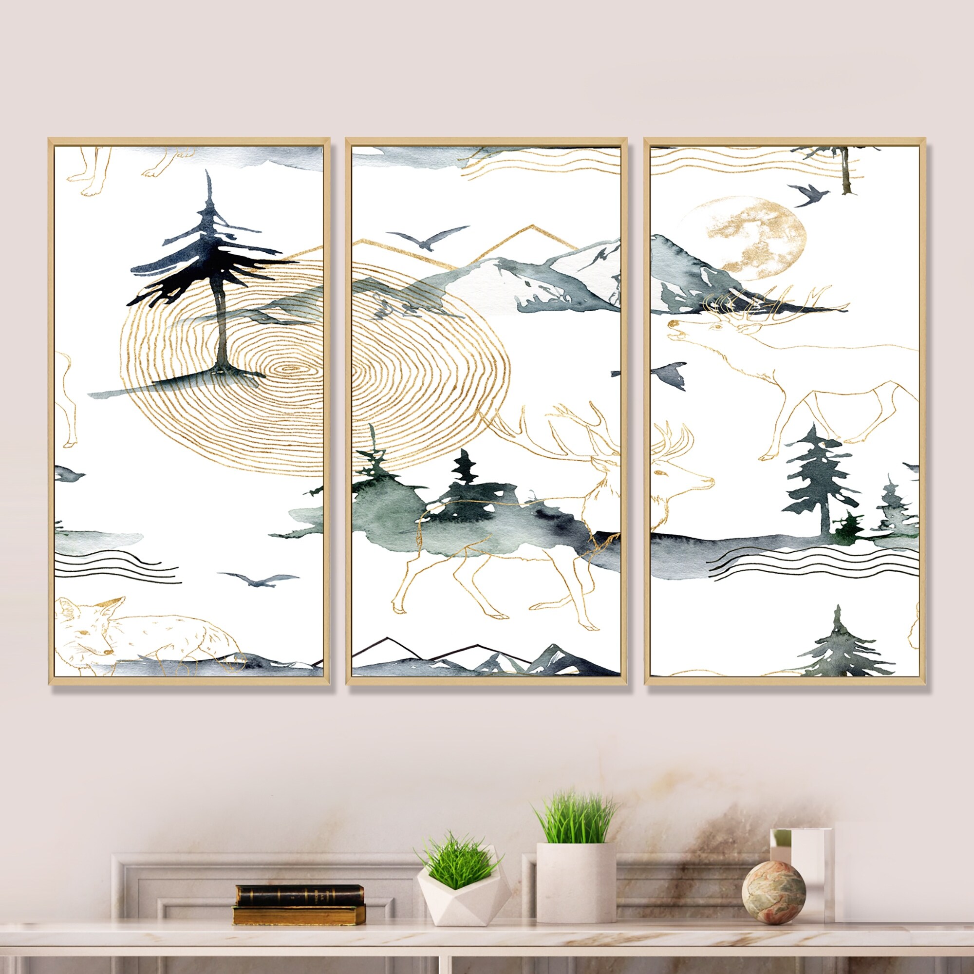 Designart "Minimalistic Gouache With Mountains Trees And Deer" Modern Framed Wall Decor Set of 3 - 4 Colors of Frames