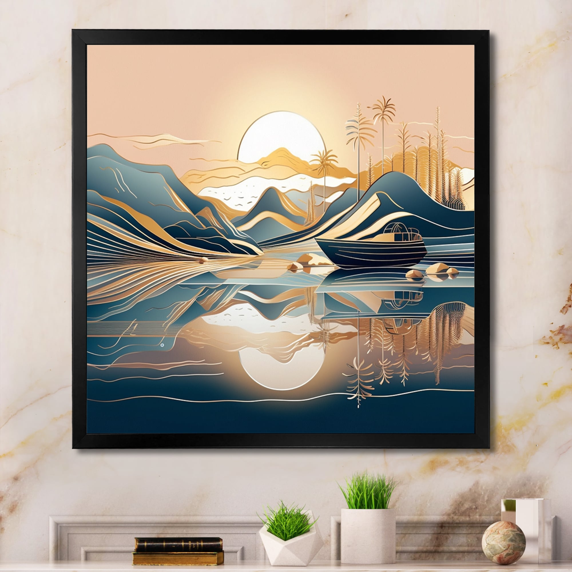 Designart "Gold Metallic Coastal Paradise Ii" Minimalism Landscape Framed Wall Art Prints