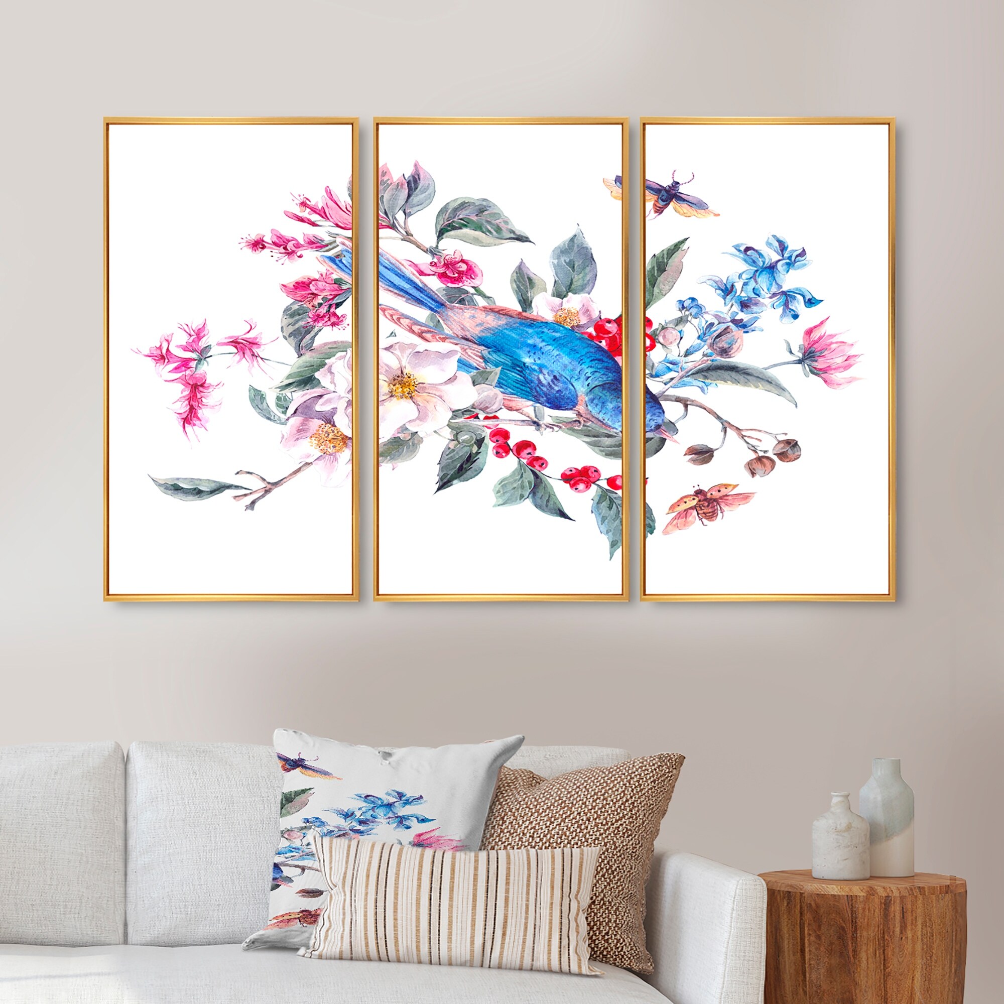 Designart "Vintage Bouquet of Pink Flowers Beetles And Birds" Traditional Framed Wall Decor Set of 3 - 4 Colors of Frames