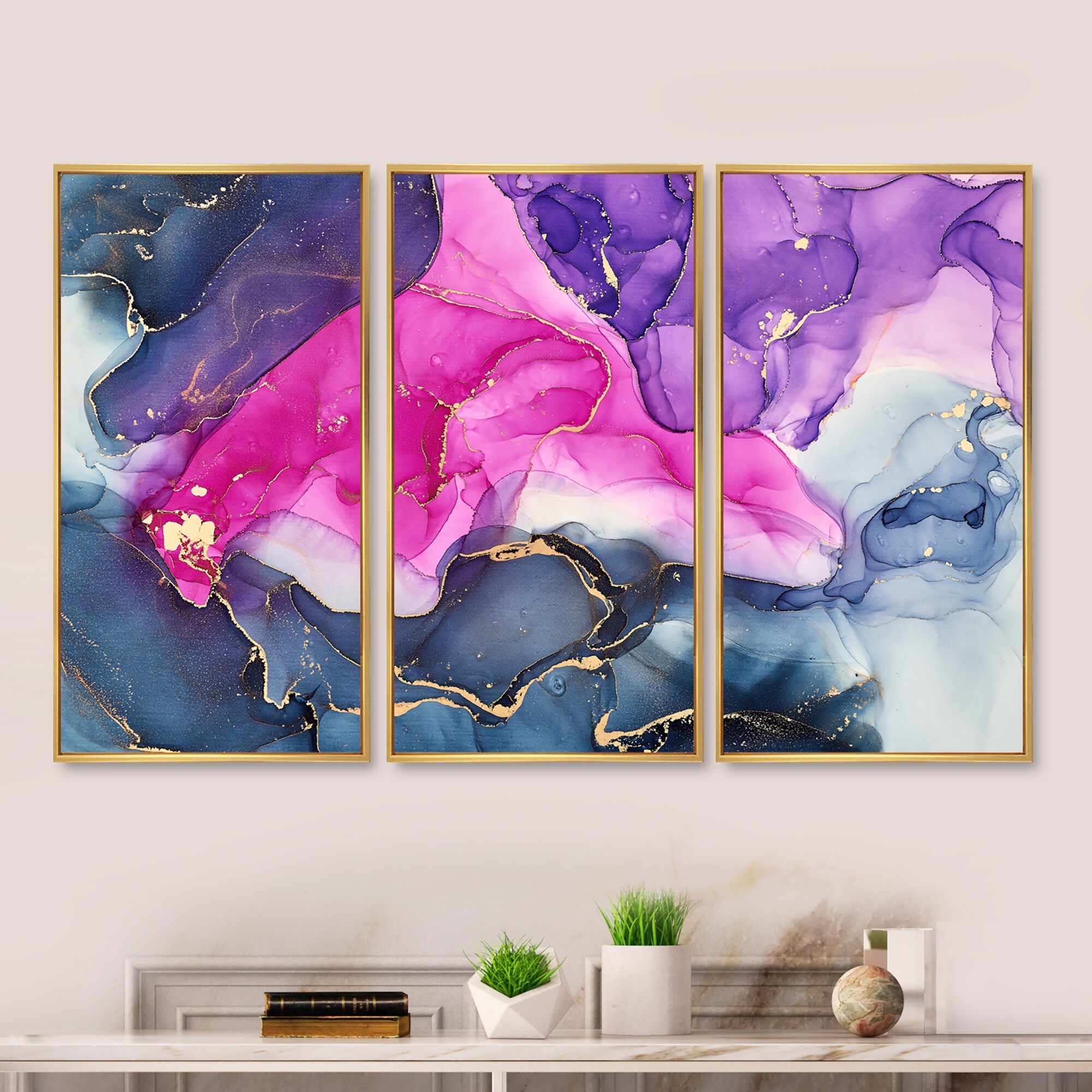 Designart "Pink And Purple Luxury Abstract Fluid Art" Modern Framed Canvas Wall Art Print Set of 3 - 4 Colors of Frames